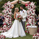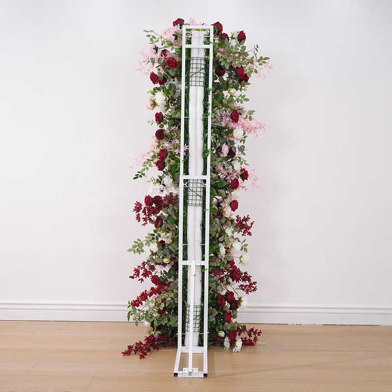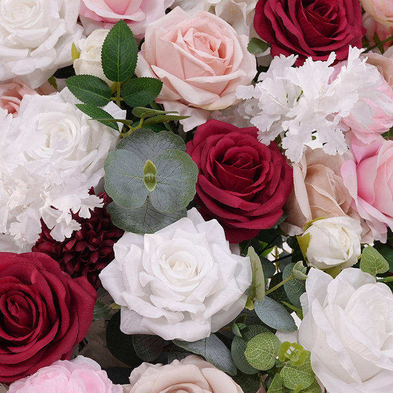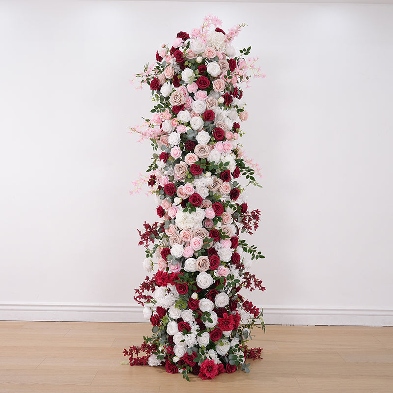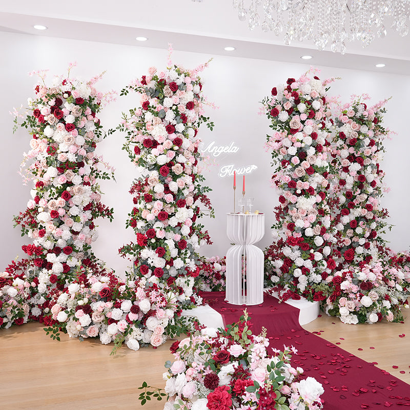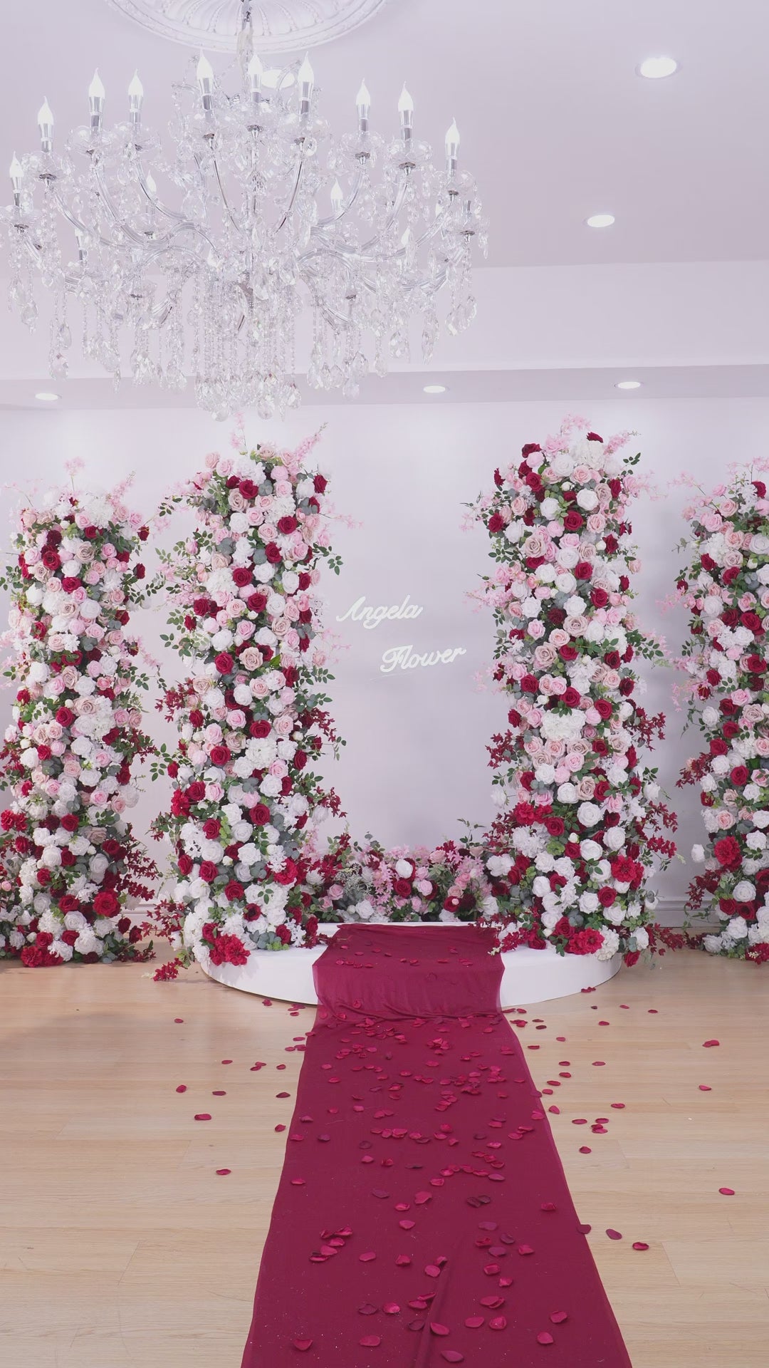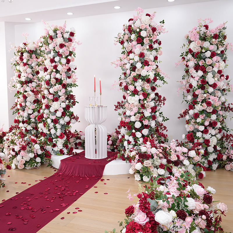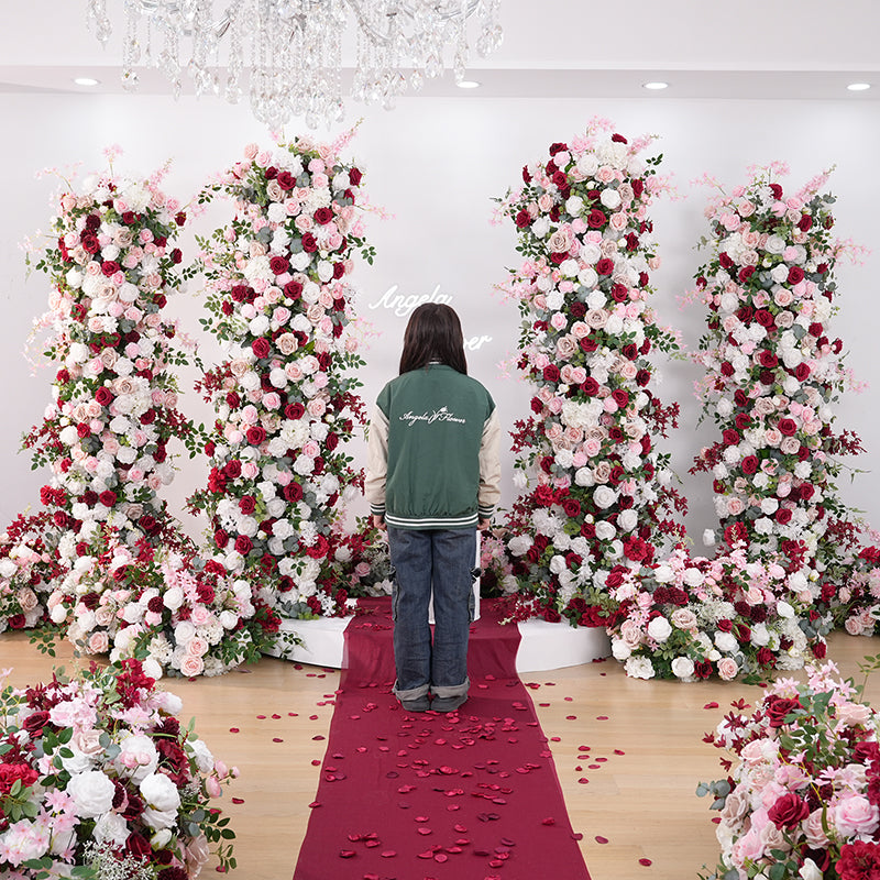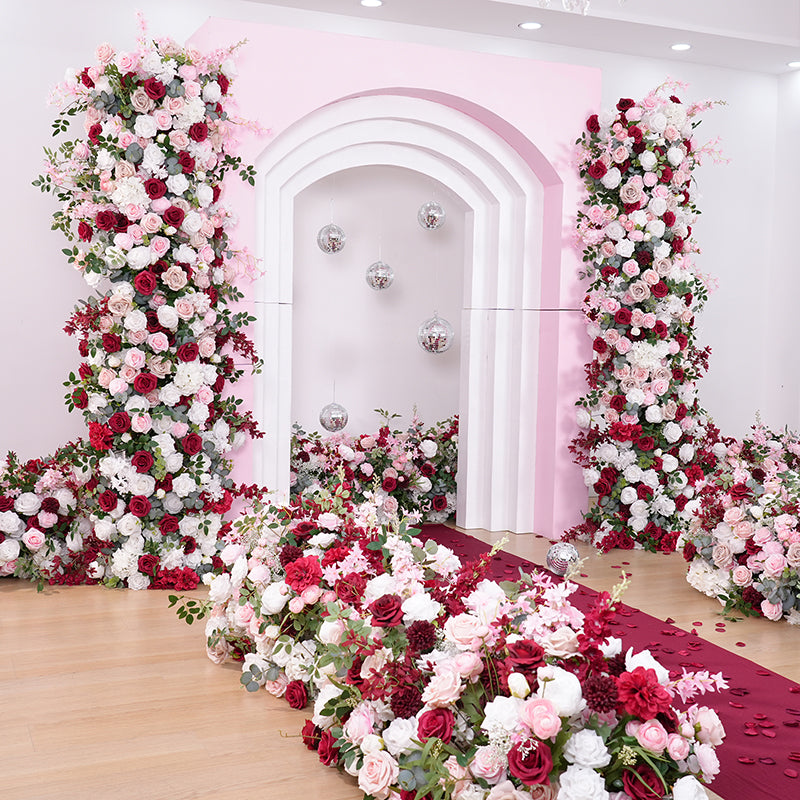 Color Inspiration: A flower arrangement featuring bean pink, wine red, and greenery creates a rich, romantic, and elegant atmosphere for weddings. The soft pink adds tenderness, the wine red brings passion and drama, and the greenery provides freshness and balance. Together, they create a lush and inviting aesthetic, perfect for setting the tone of love and celebration on the special day. This color combination can enhance various wedding elements, from aisle floor flower to backdrop flower arrangement and overall decor, making it a versatile choice for couples.