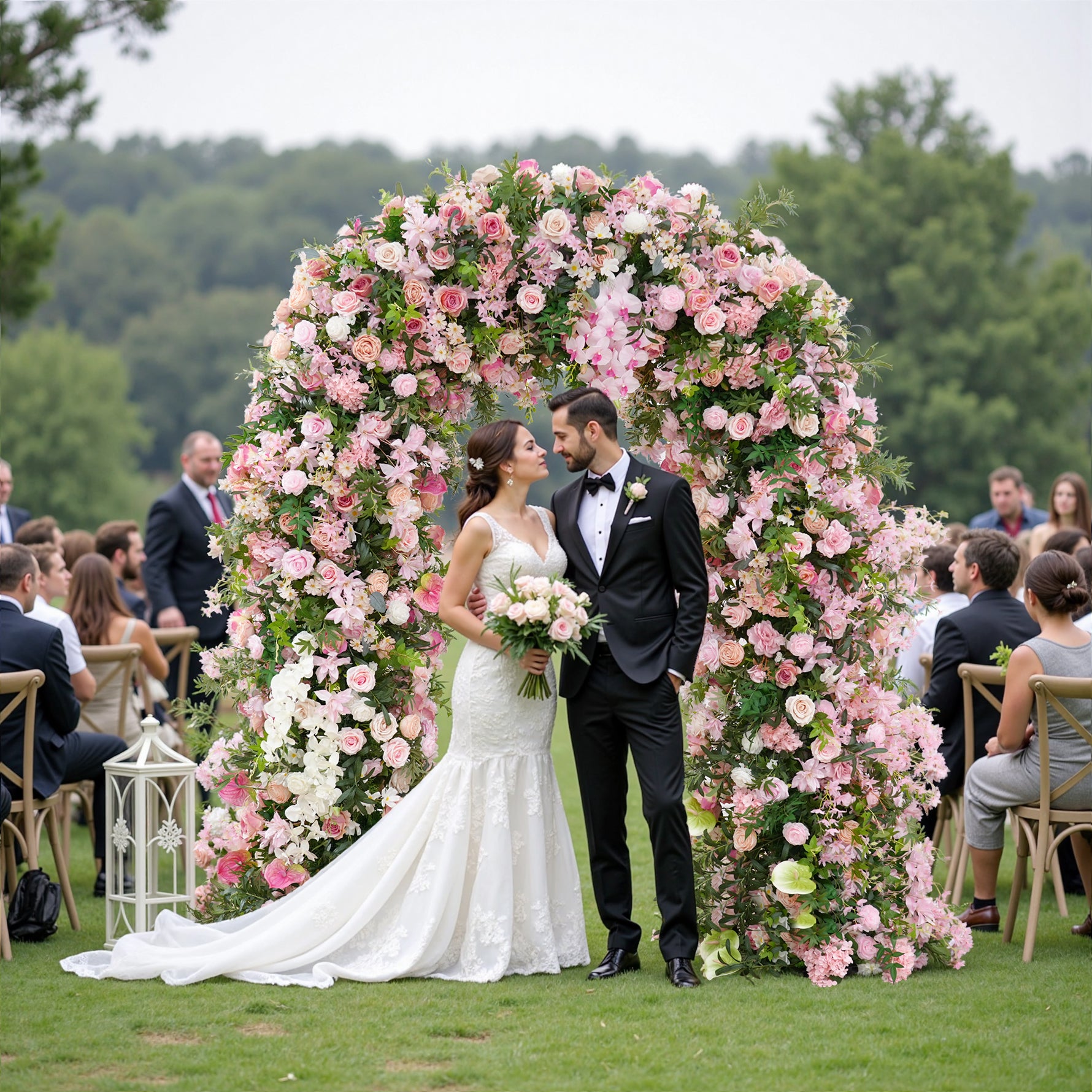Color Inspiration: This pink greenery rustic style arch is decorated with a lot of greenery, flowers and other natural elements, the new couple walks through such an arch hand in hand, signifying that they open a happy and fulfilling married life together, as if they have entered a peaceful and beautiful idyllic world, and they are full of hope and sweetness for the days ahead.