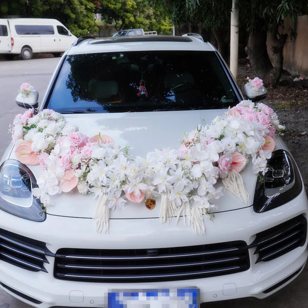 Color Inspiration: Decorating your wedding car with a variety of carefully selected light pink roses and lilies not only enhances the visual effect of the wedding, but also conveys the couple's cherished love and anticipation of marriage, creating a romantic and unforgettable wedding for you.