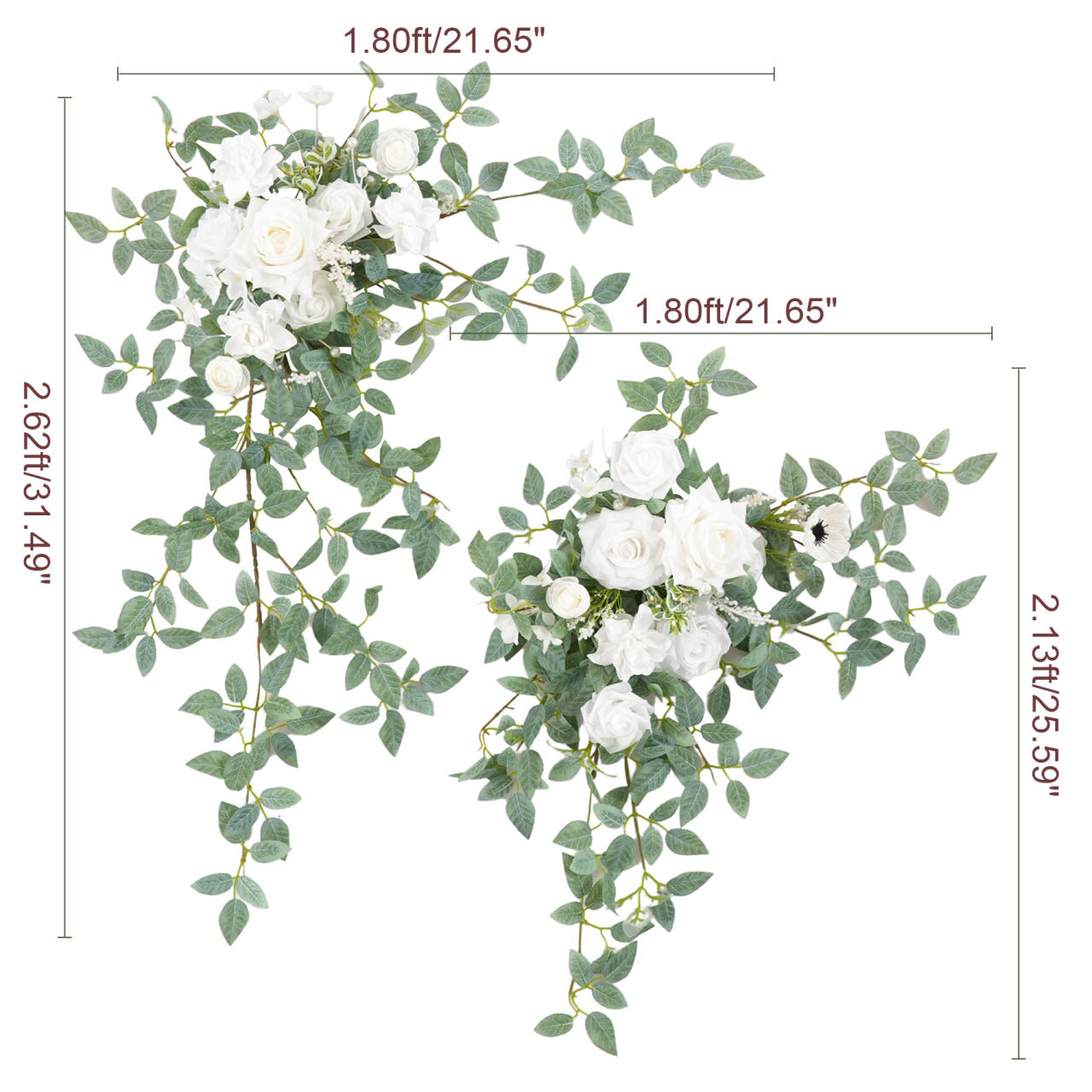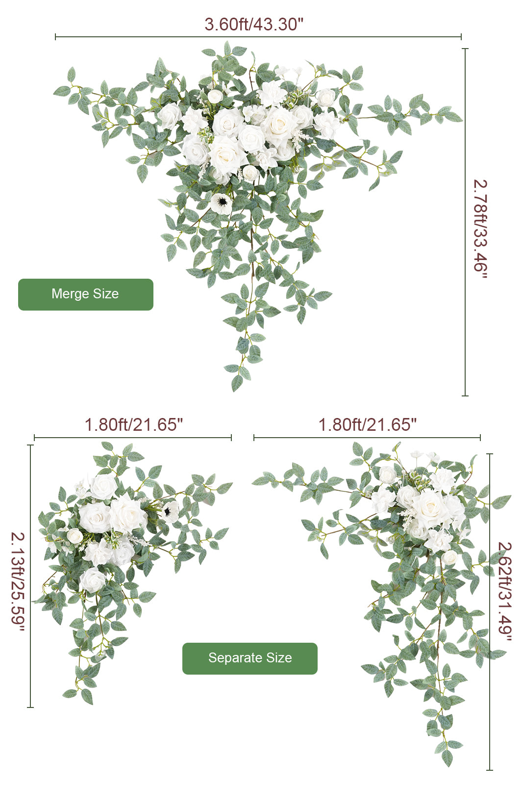 Size: Two artificial flowers can be merged and used together, or they can be used separately, depending on what you like. After the two flowers are combined, the approximate dimensions are 43'' by 33''. One flower corner swag design measures about 21.6"L x 25.5" W, another flower tie measures 21.6"L x 31.4" W.