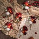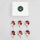 Color Inspiration: Carefully designed with deep crimson roses as the star, this 6-piece boutonniere set is accentuated by minimalist details and preserved botanicals. The exquisite craftsmanship is evident in every detail, offering a modern and stylish embellishment for the groom and his groomsmen.