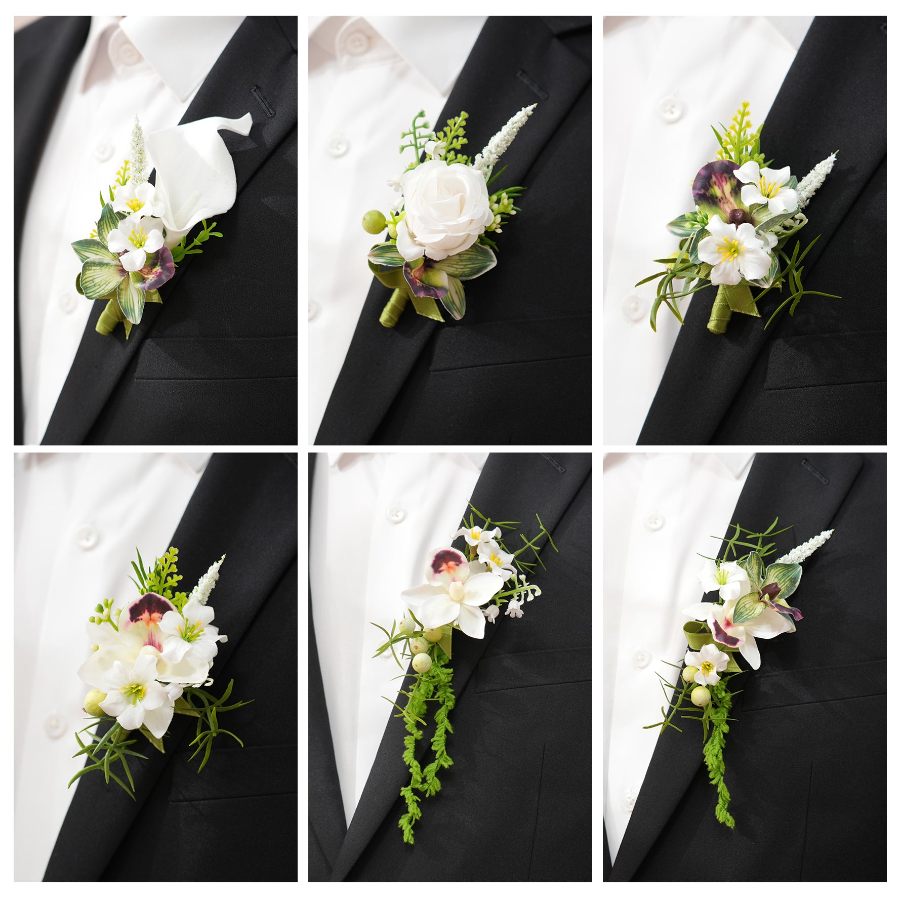 Size and package: Each boutonniere is approx. 0.39ft L x 0.22ft W, suitable for all men; The set includes six boutonnieres in total, with 6 different styles. 1 for Groom, and others for groomsmen or any important guest.