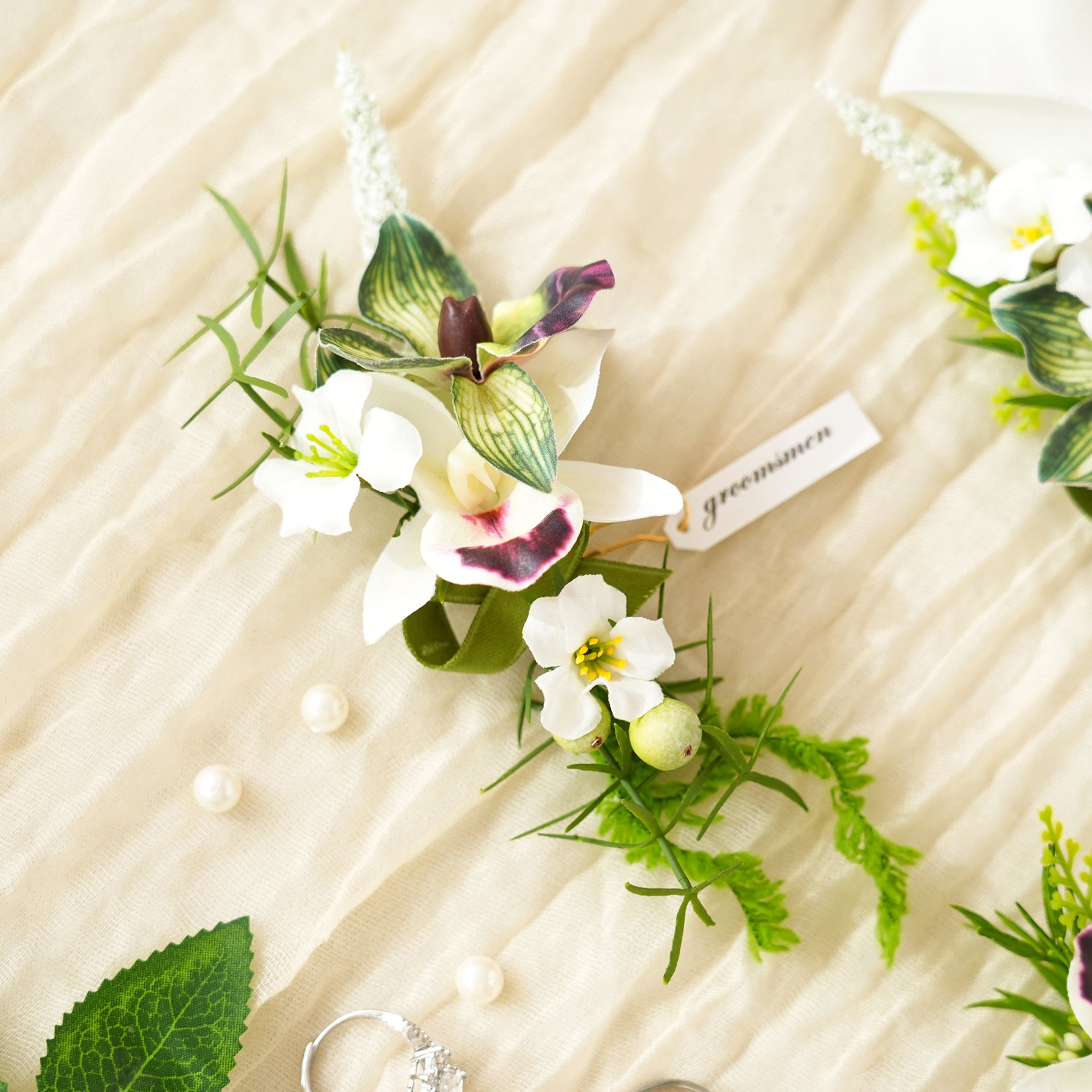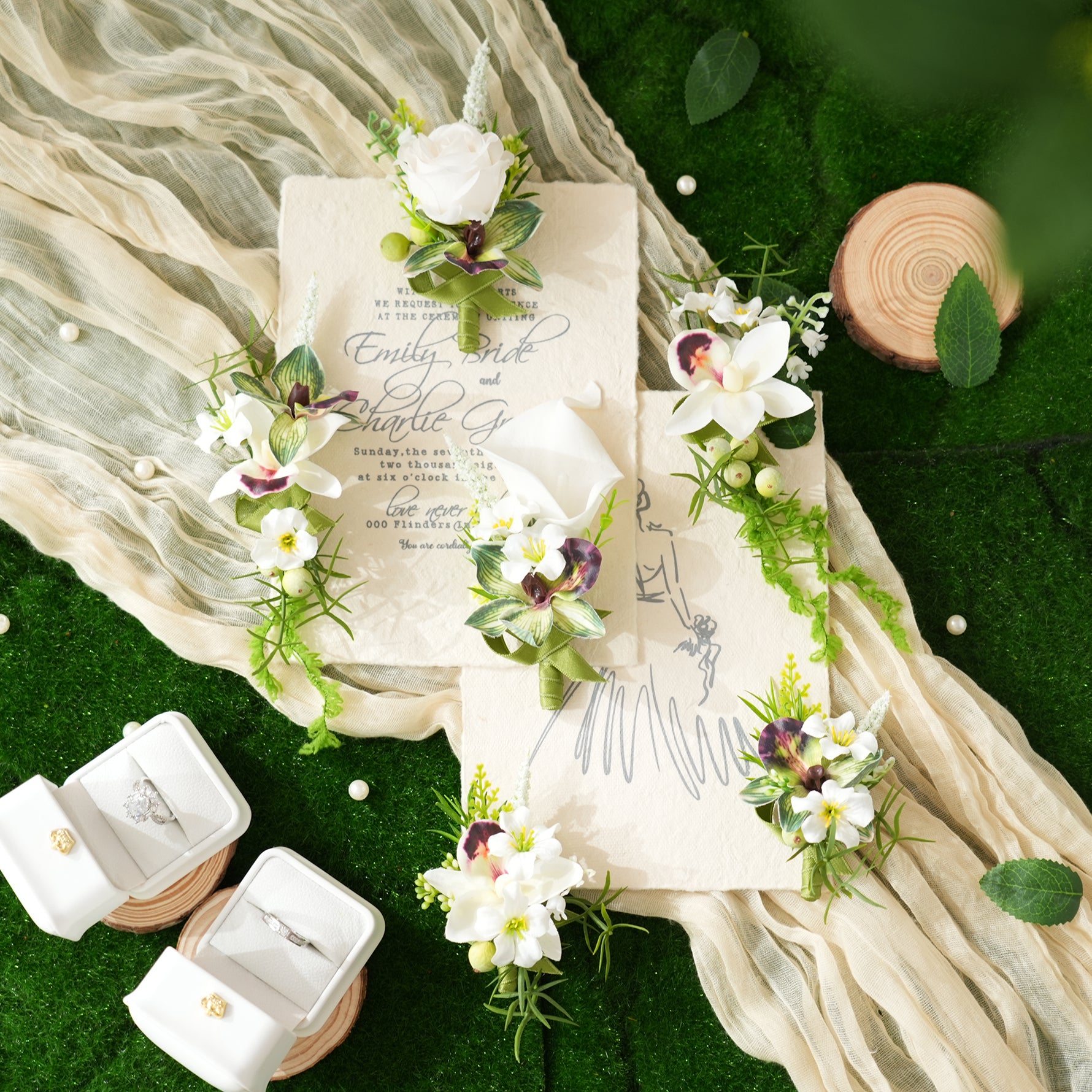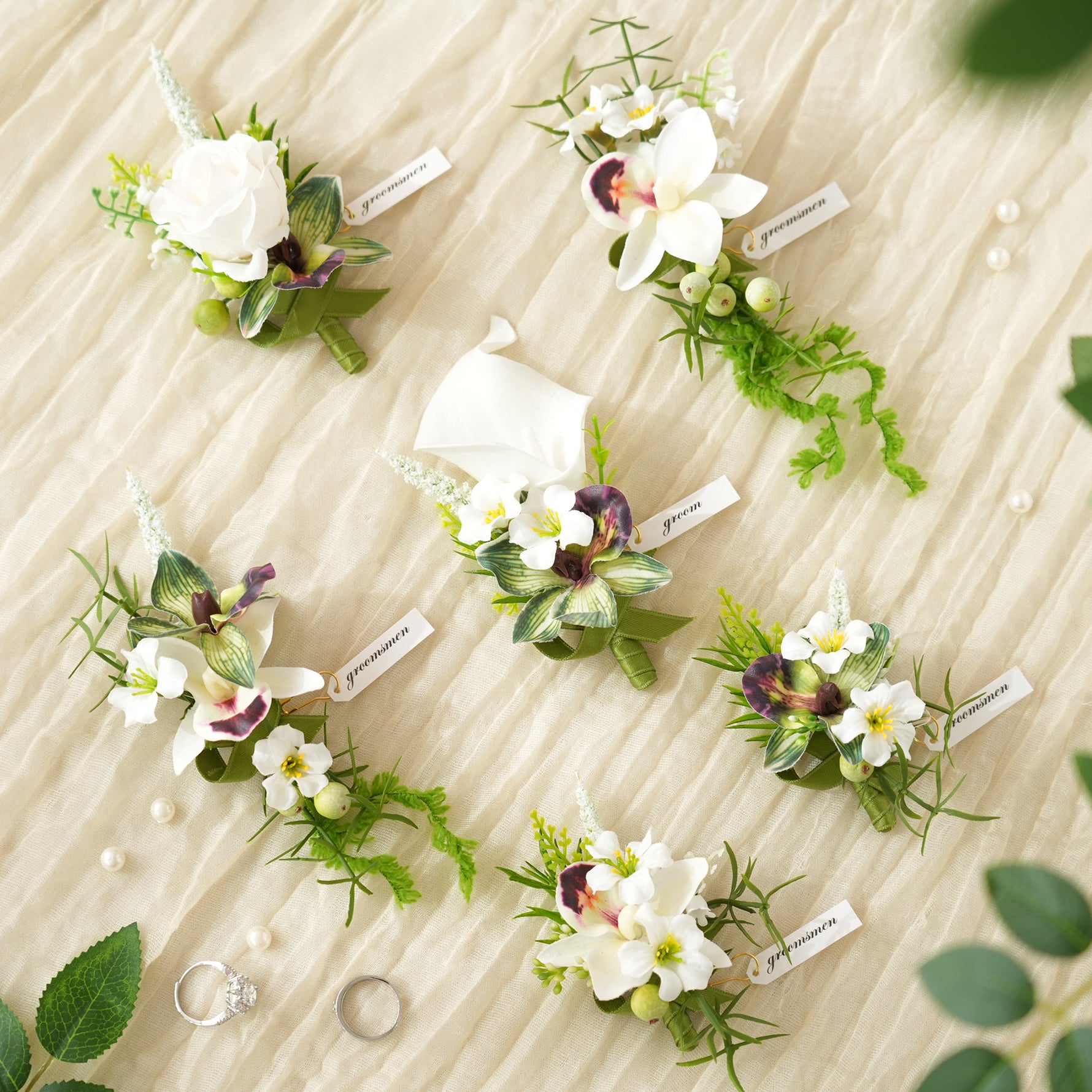 Color Inspiration: Elevate your groom's style with this 6-piece artificial white and green woodland boutonniere set. Perfect for rustic weddings, nature-themed events, or adding a touch of earthy elegance. Lightweight and comfortable, they securely attach to lapels. Versatile and charming, complementing various suit colors.