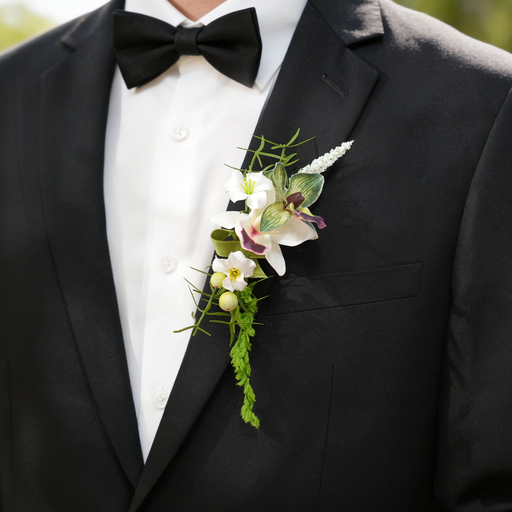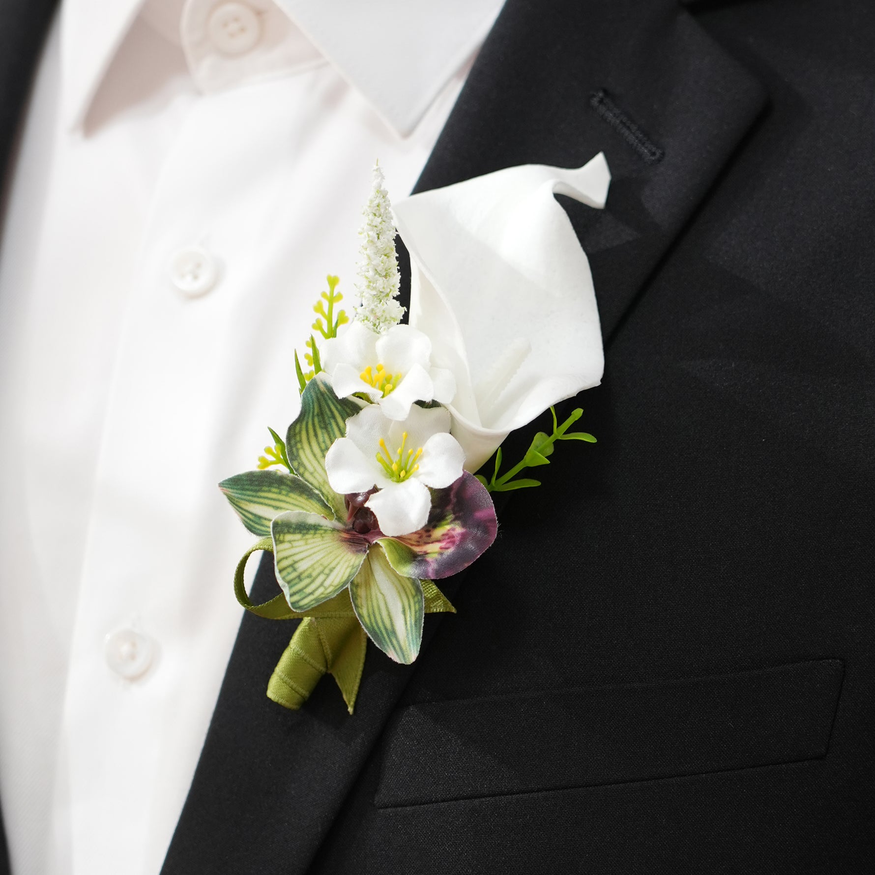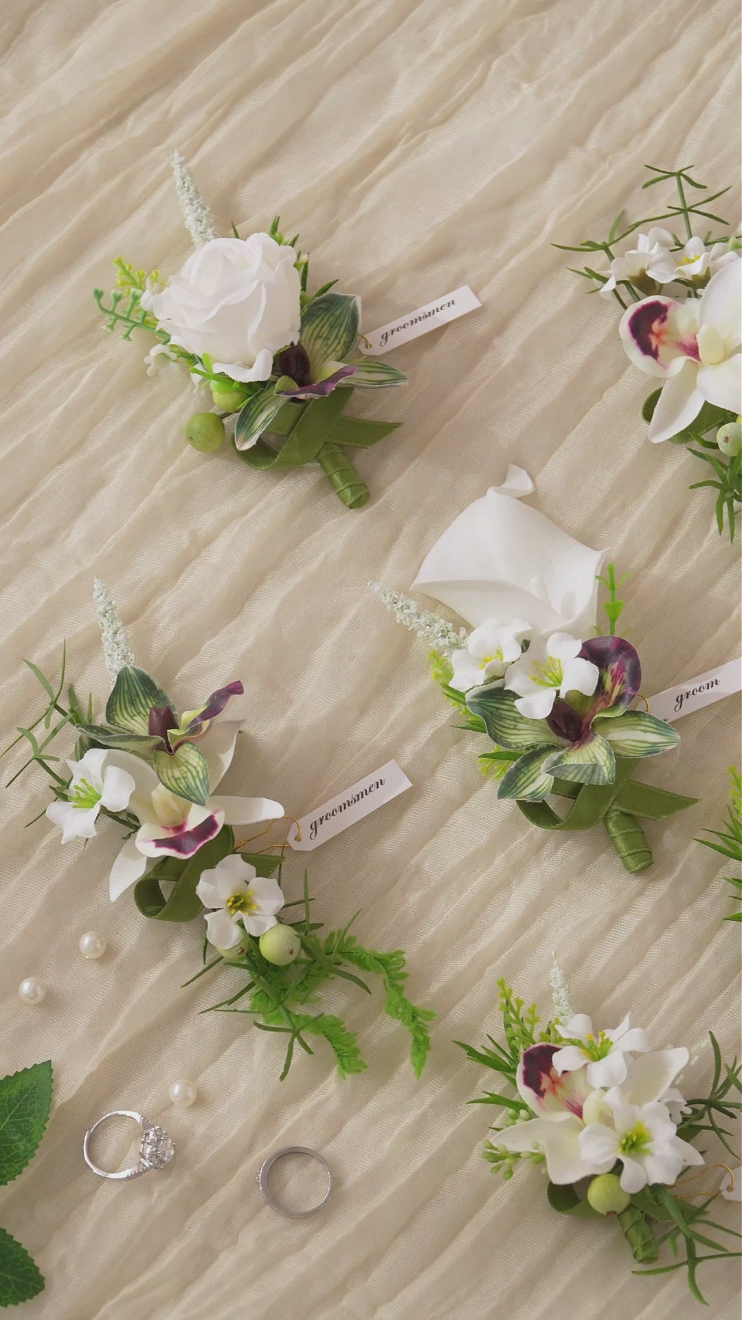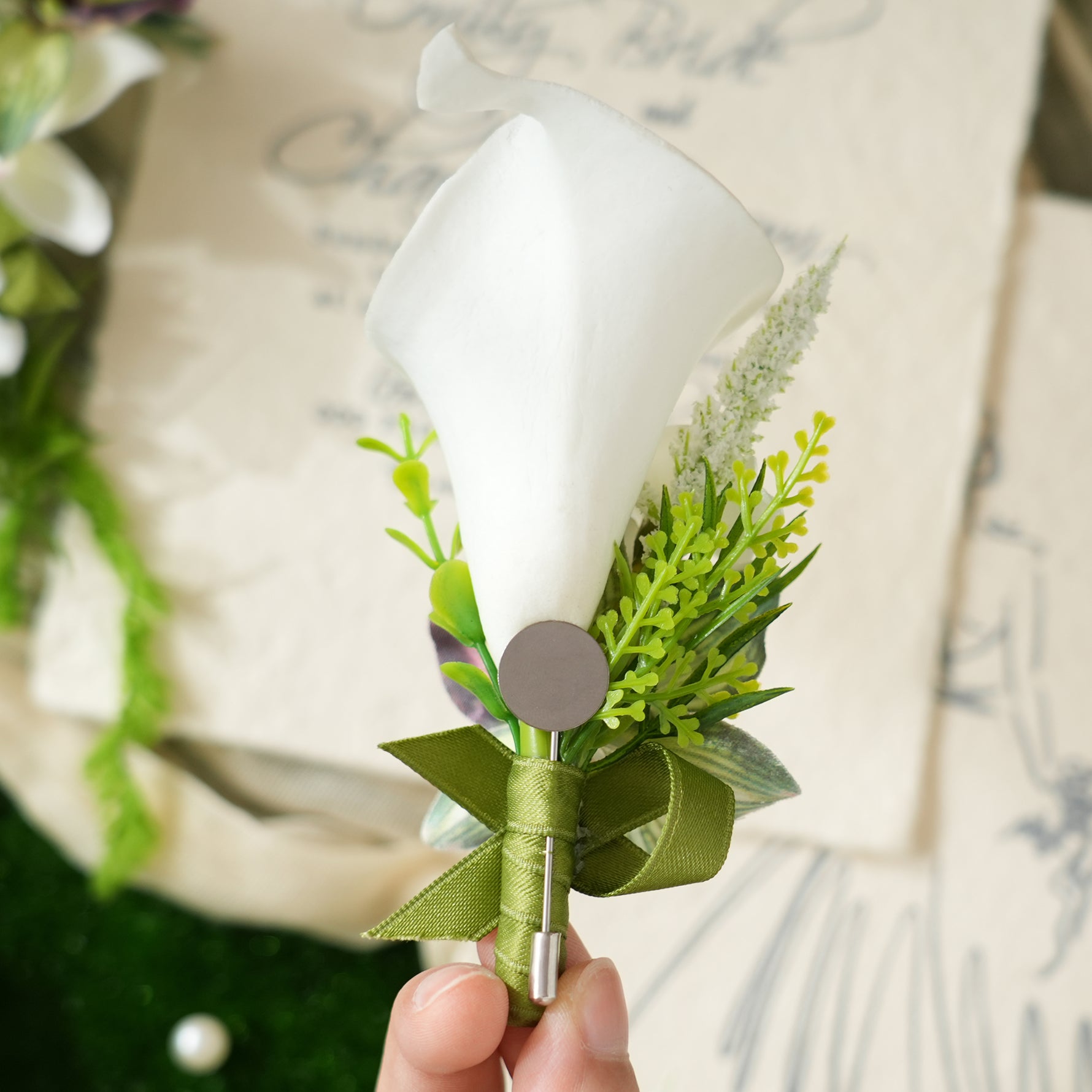 Color Inspiration: Elevate your groom's style with this 6-piece artificial white and green woodland boutonniere set. Perfect for rustic weddings, nature-themed events, or adding a touch of earthy elegance. Lightweight and comfortable, they securely attach to lapels. Versatile and charming, complementing various suit colors.