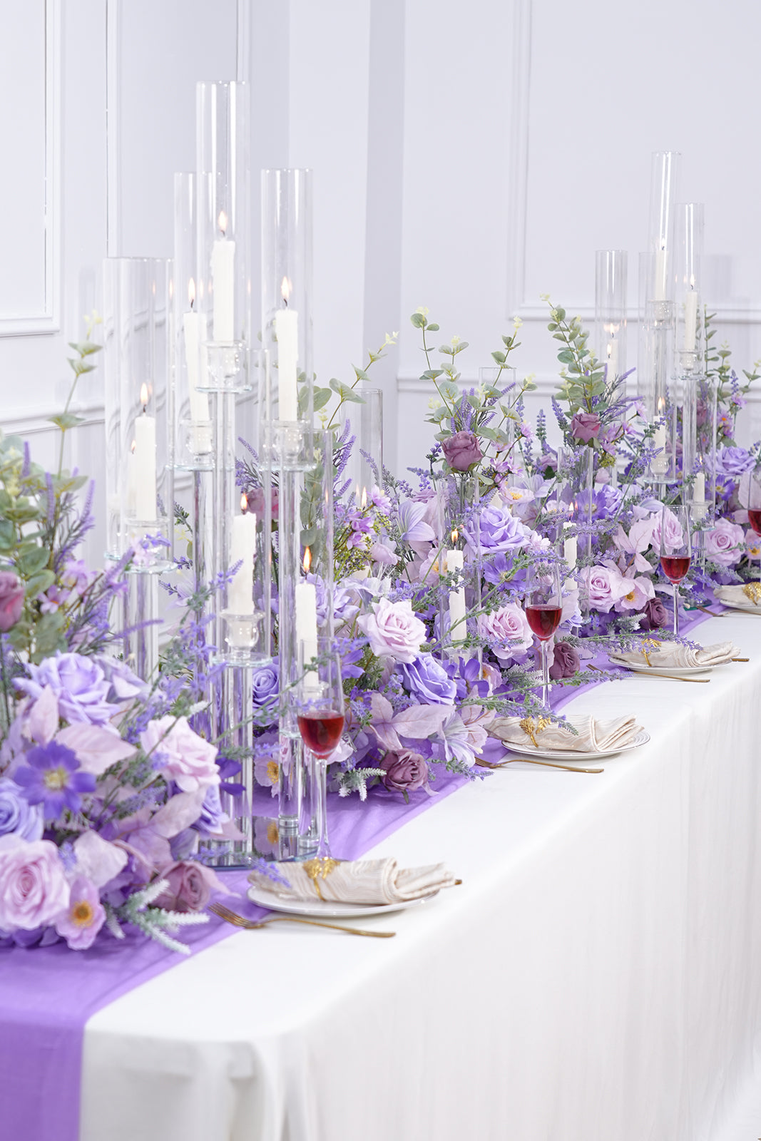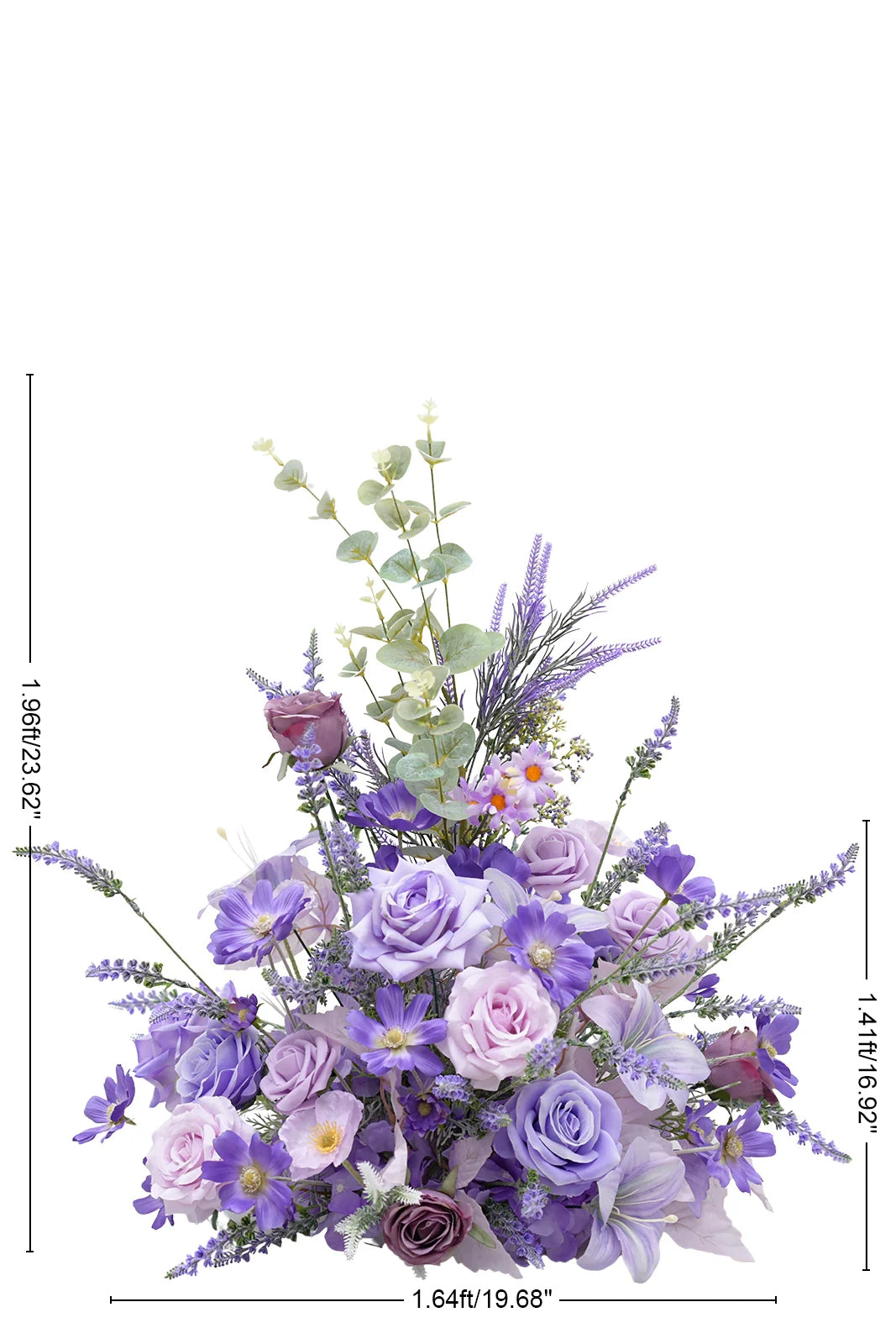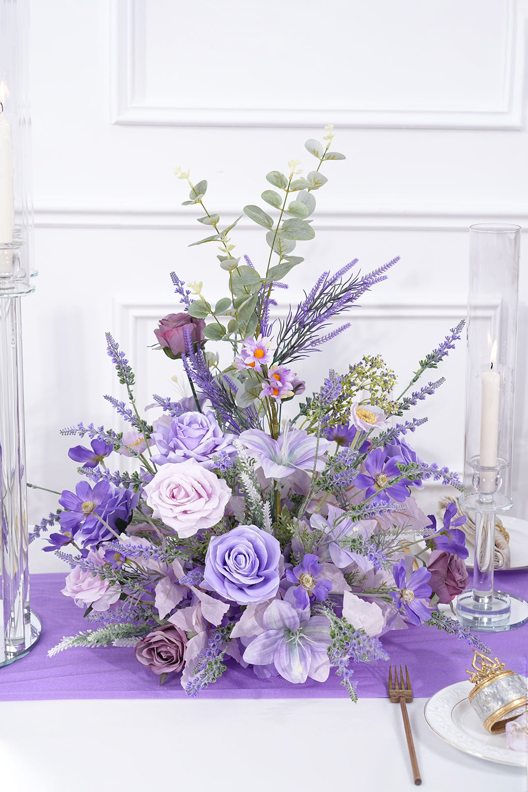 Color Inspiration: Inspired by the mysterious deep purple color, this table flower skillfully intertwines the dreamy purple of lavender with the rich purple of roses, as romantic and charming as a river of stars on a dark night. The fresh greenness of eucalyptus leaves adds vibrancy, making the color layers rich and harmonious. Injecting a different kind of romance and warmth into every event.