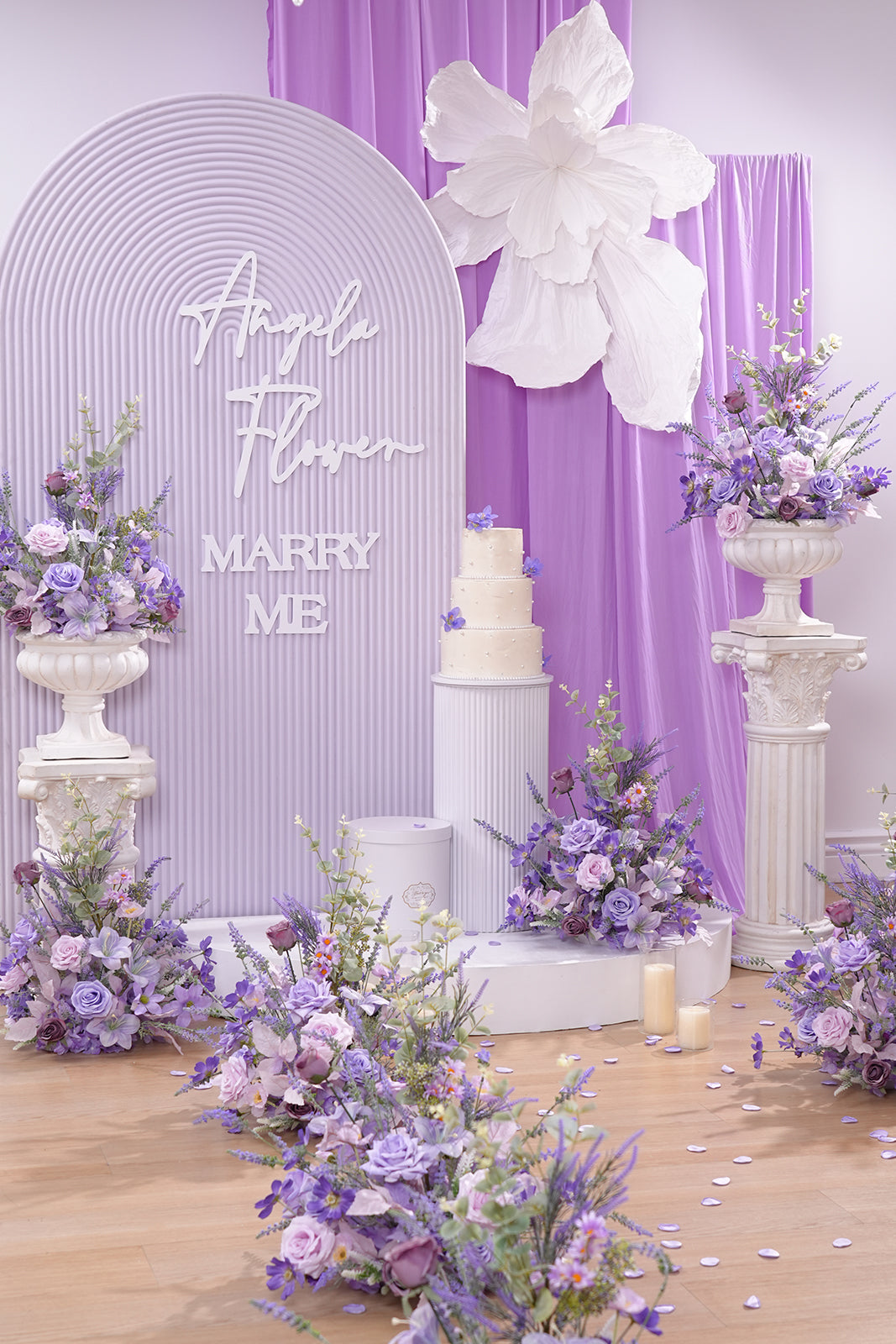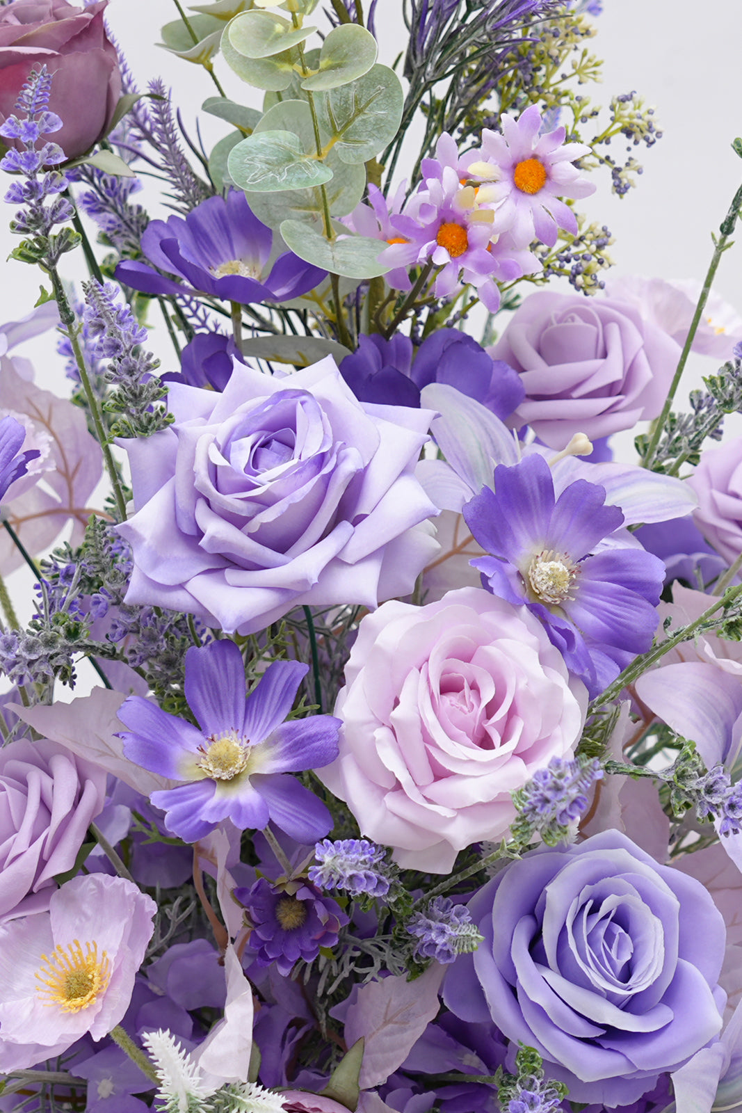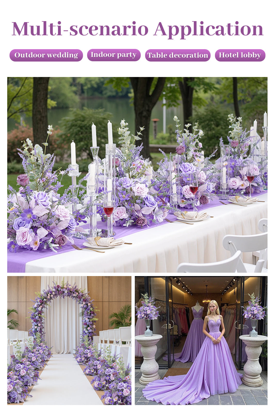 Color Inspiration: Inspired by the mysterious deep purple color, this table flower skillfully intertwines the dreamy purple of lavender with the rich purple of roses, as romantic and charming as a river of stars on a dark night. The fresh greenness of eucalyptus leaves adds vibrancy, making the color layers rich and harmonious. Injecting a different kind of romance and warmth into every event.