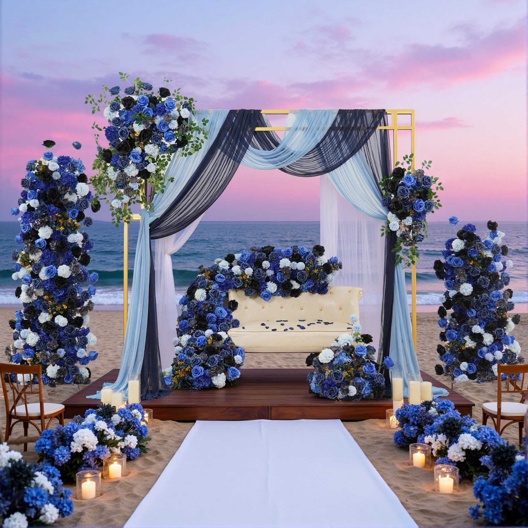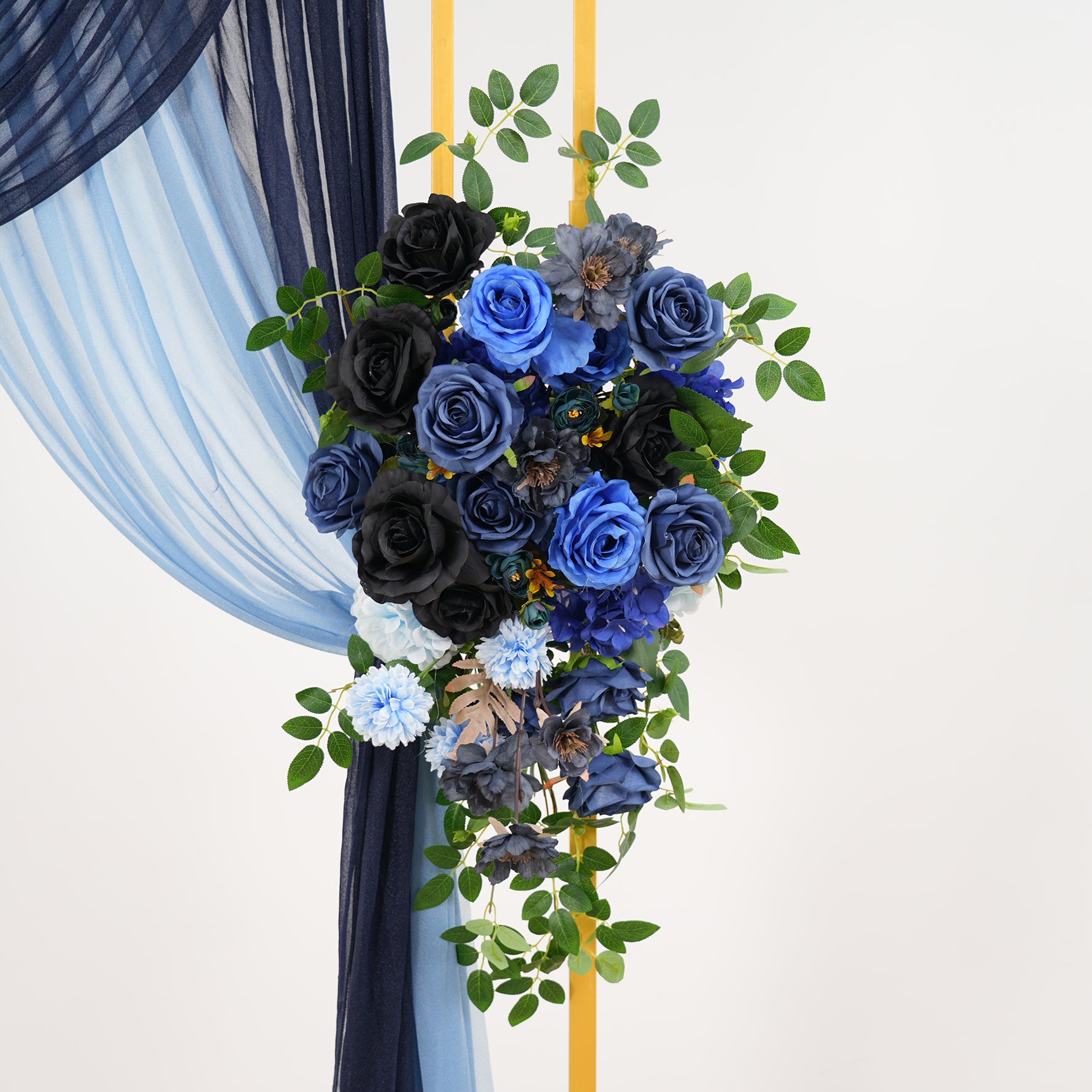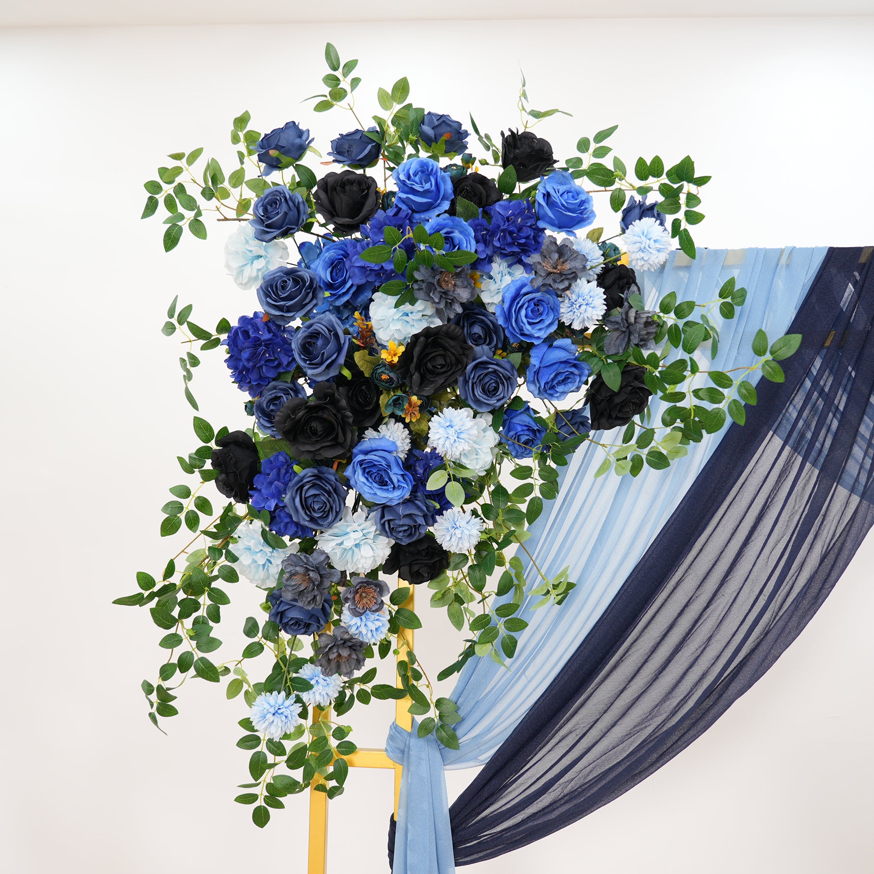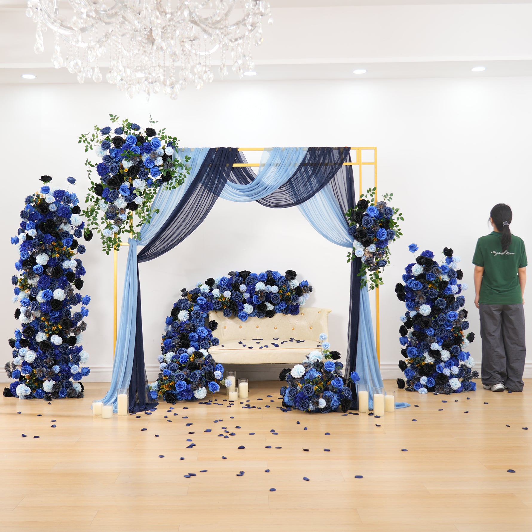 Color Inspiration: Make a statement with our Blue & Black Floral Set. Roses, hydrangeas, and greenery create a visually stunning display. Includes runner, backdrop, and hanging flower for a cohesive, dramatic look. Perfect for creating a memorable ambiance.