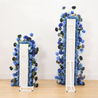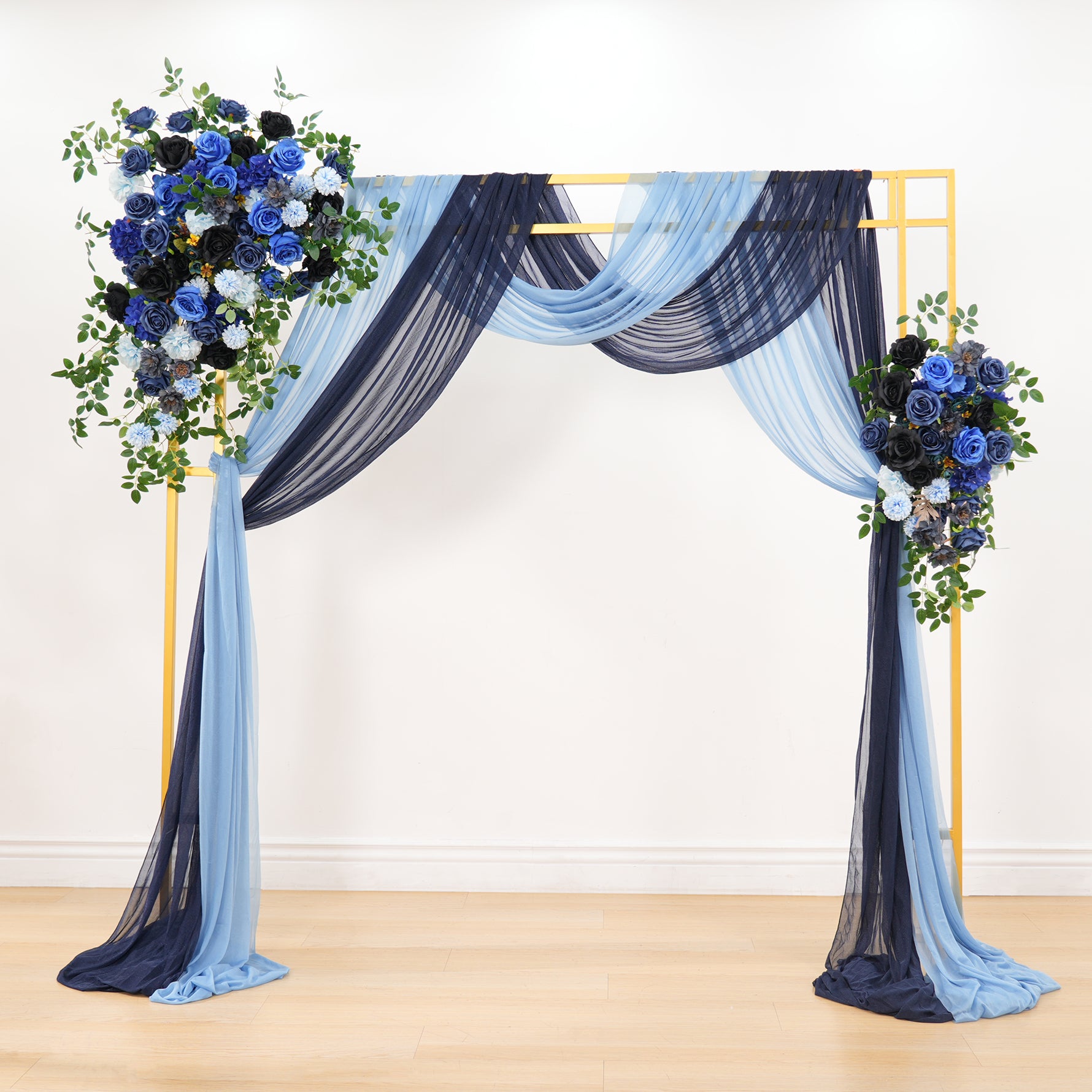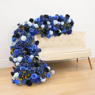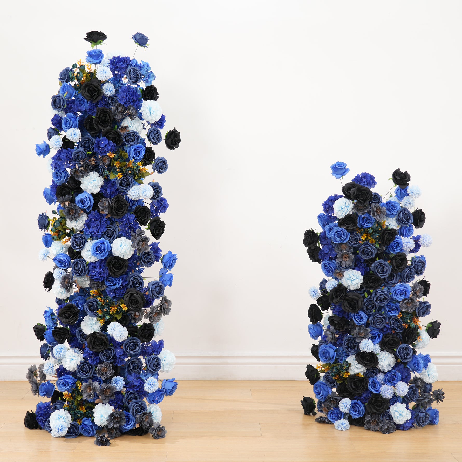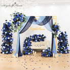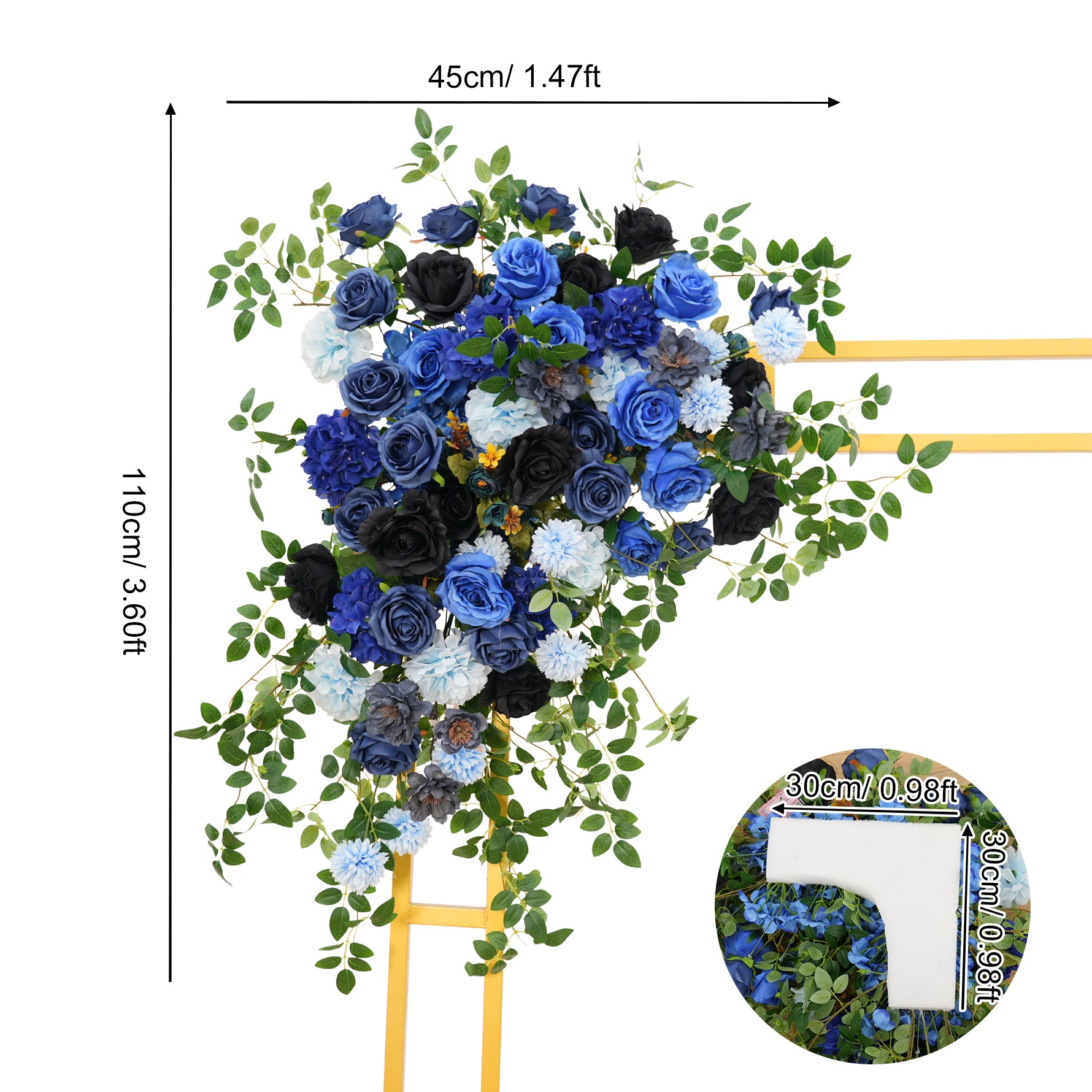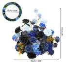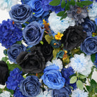 Color Inspiration: Make a statement with our Blue & Black Floral Set. Roses, hydrangeas, and greenery create a visually stunning display. Includes runner, backdrop, and hanging flower for a cohesive, dramatic look. Perfect for creating a memorable ambiance.