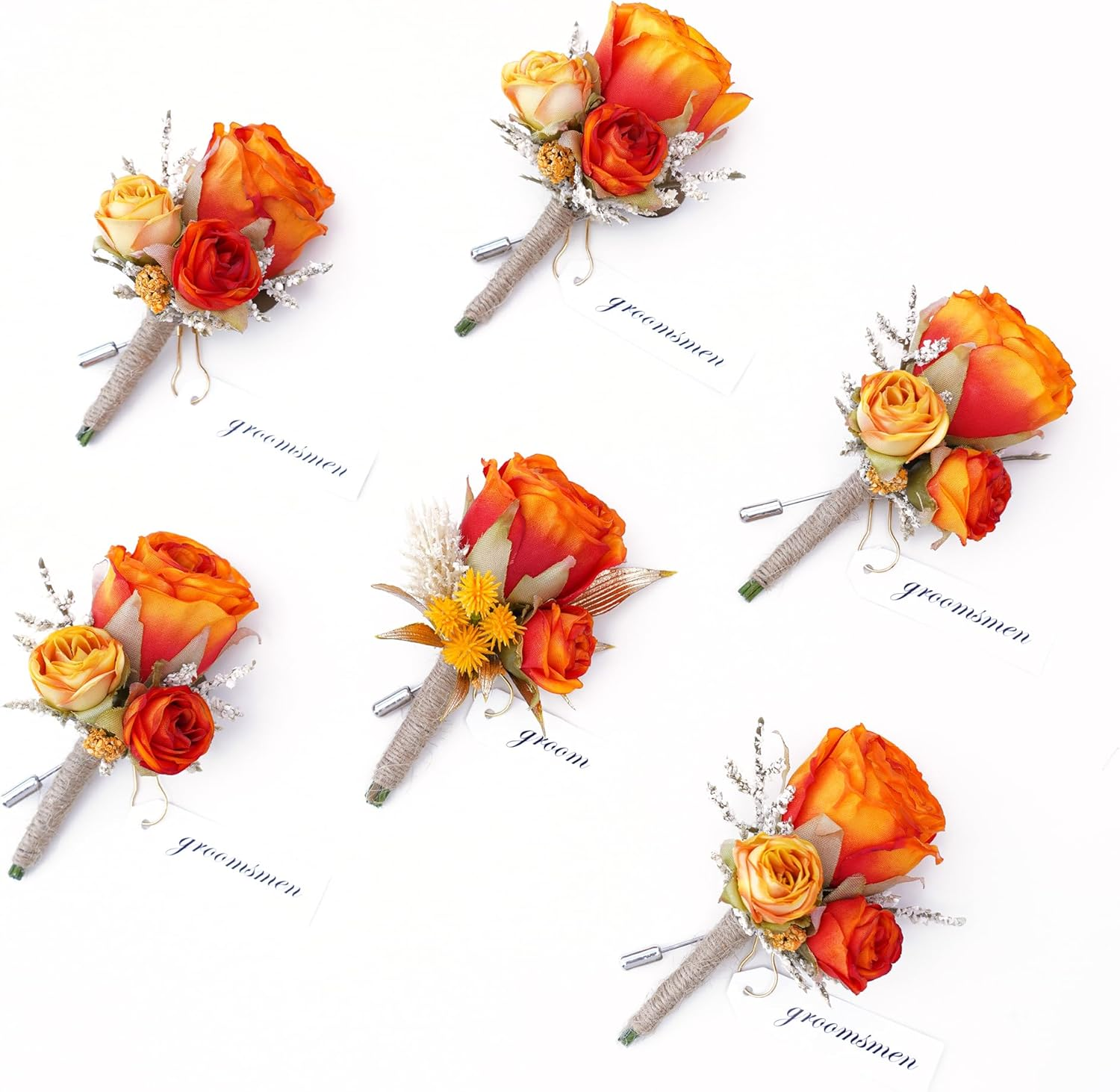 Size and package: Each boutonniere is approx. 3.1'' W x 4.1'' H, suitable for all men. The set includes six boutonnieres in total, with 6 different styles. 1 for Groom, and others for groomsmen or any important guest.