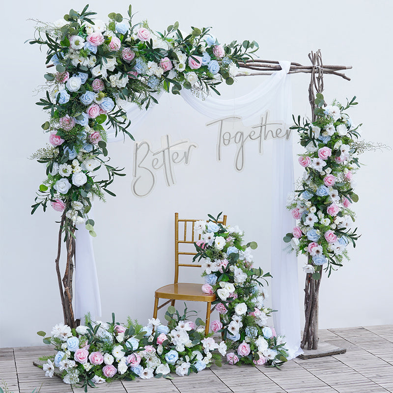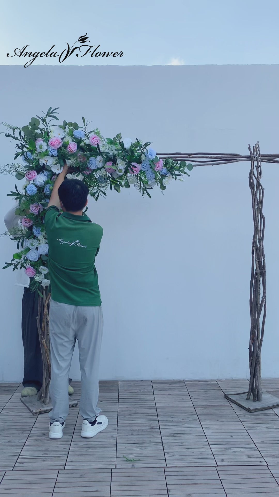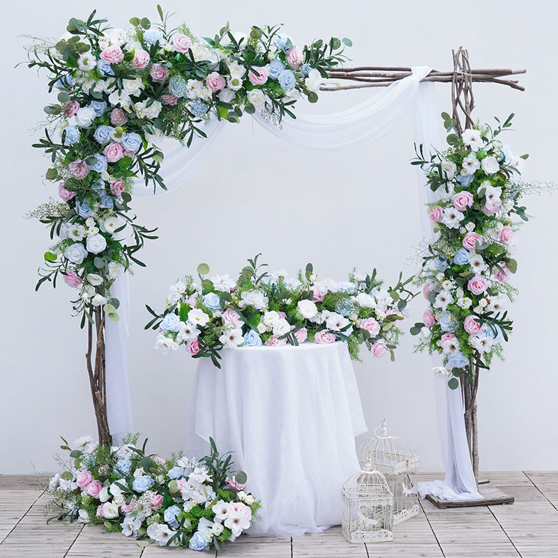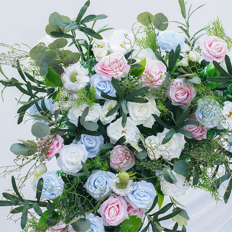 A8218 Wedding Backdrop Blue Pink Rose Green Olive Eucalyptus Leaf Floral Arrangement