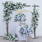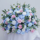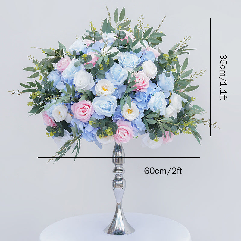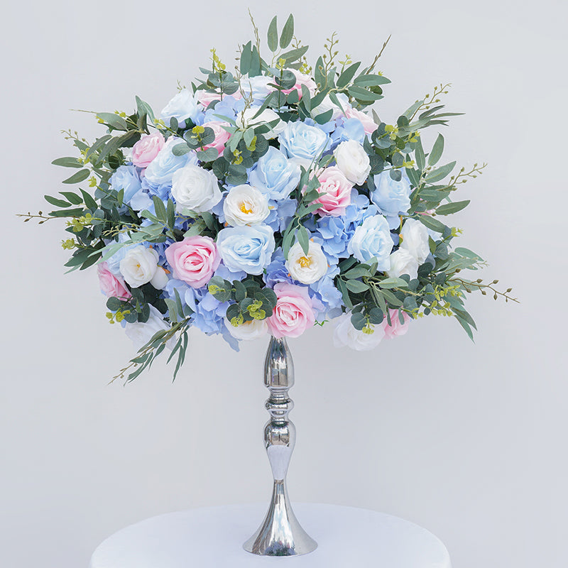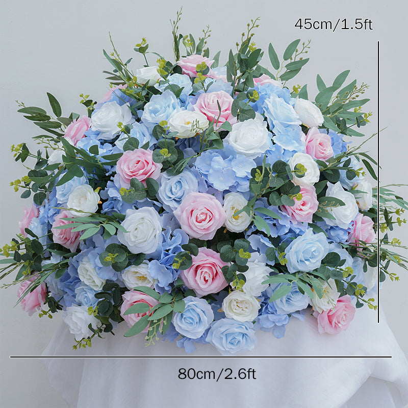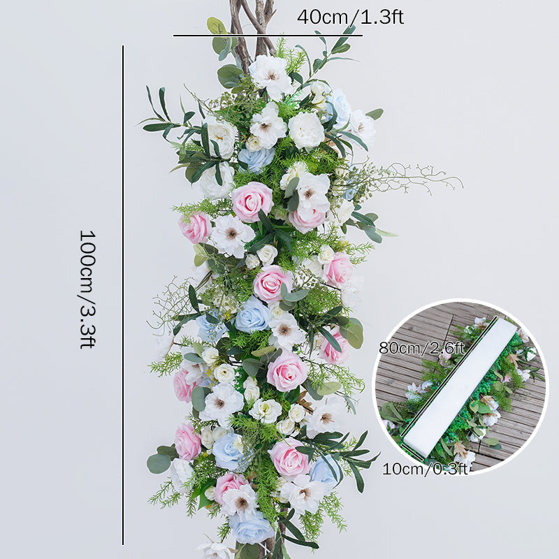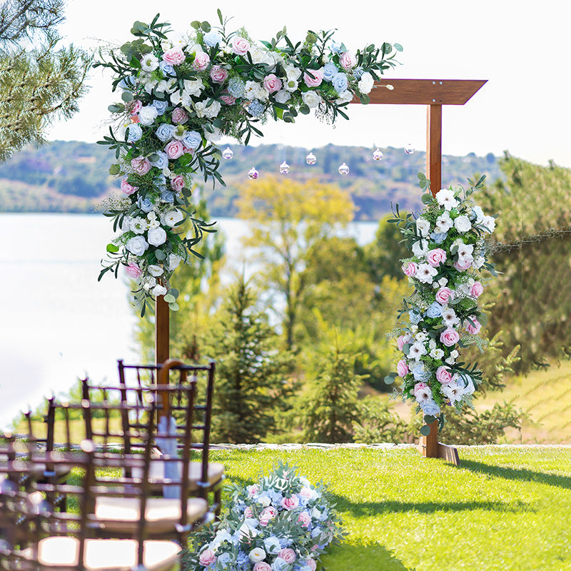 A8218 Wedding Backdrop Blue Pink Rose Green Olive Eucalyptus Leaf Floral Arrangement