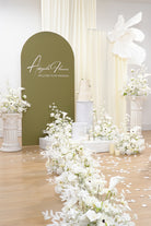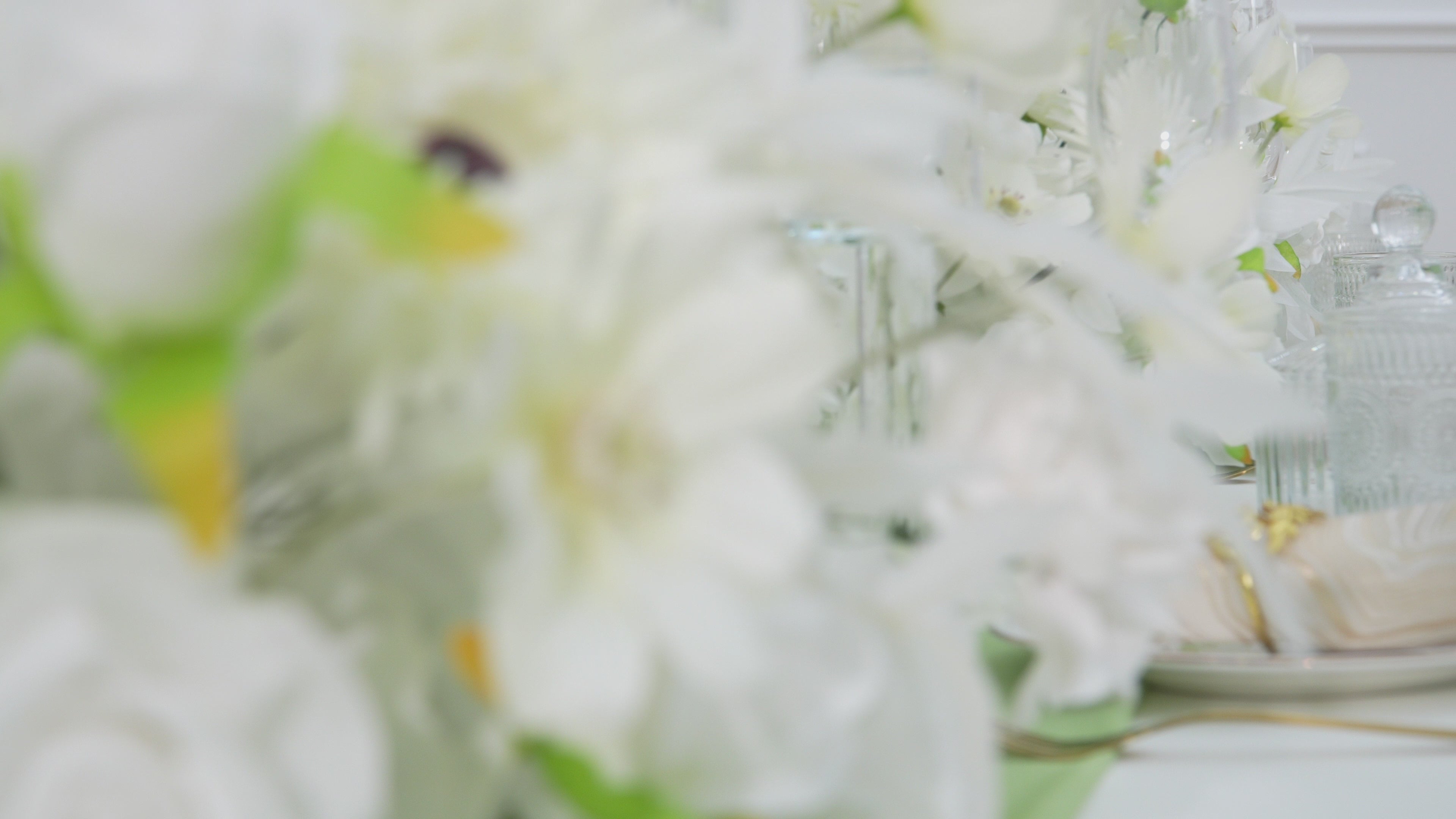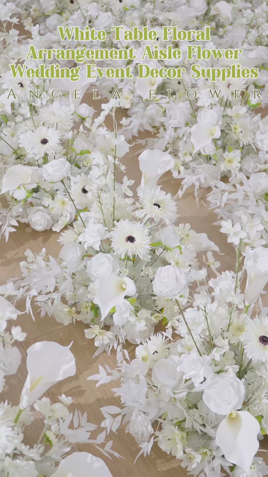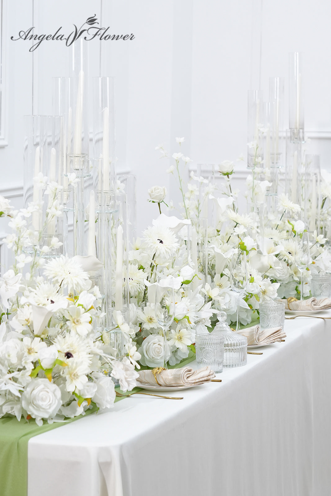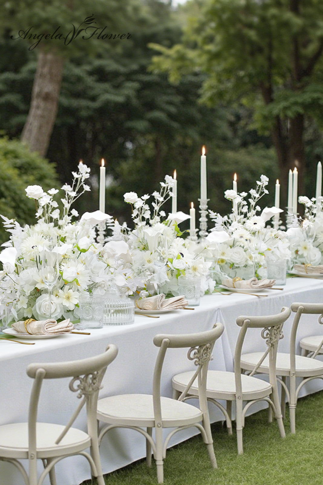 Color Inspiration: Full white roses bloom in clusters, highlighting the solemnity and warmth of love; white leaves spread lightly, outlining the rhythm of nature; small daisies dotted with stars, adding a touch of spirit and playfulness to the work. Whether placed in the center of the table as a pure and romantic visual focus, immersing guests in a peaceful and beautiful dining atmosphere, or arranged on both sides of the aisle, paving the holy road to happiness, can be a minimalist interpretation of the beauty of eternal love.