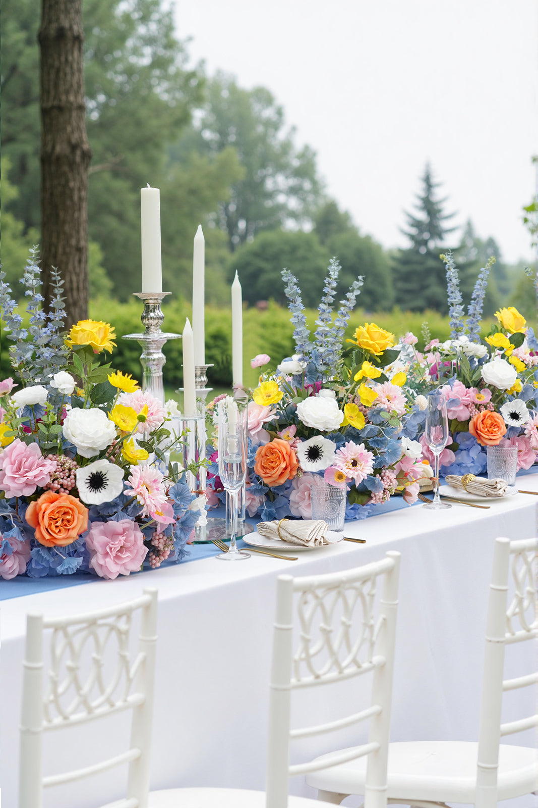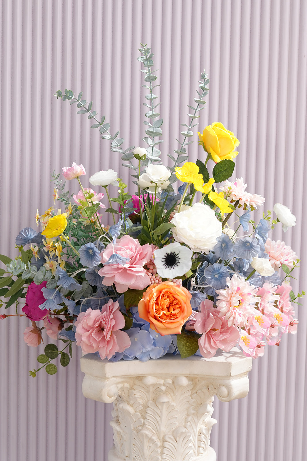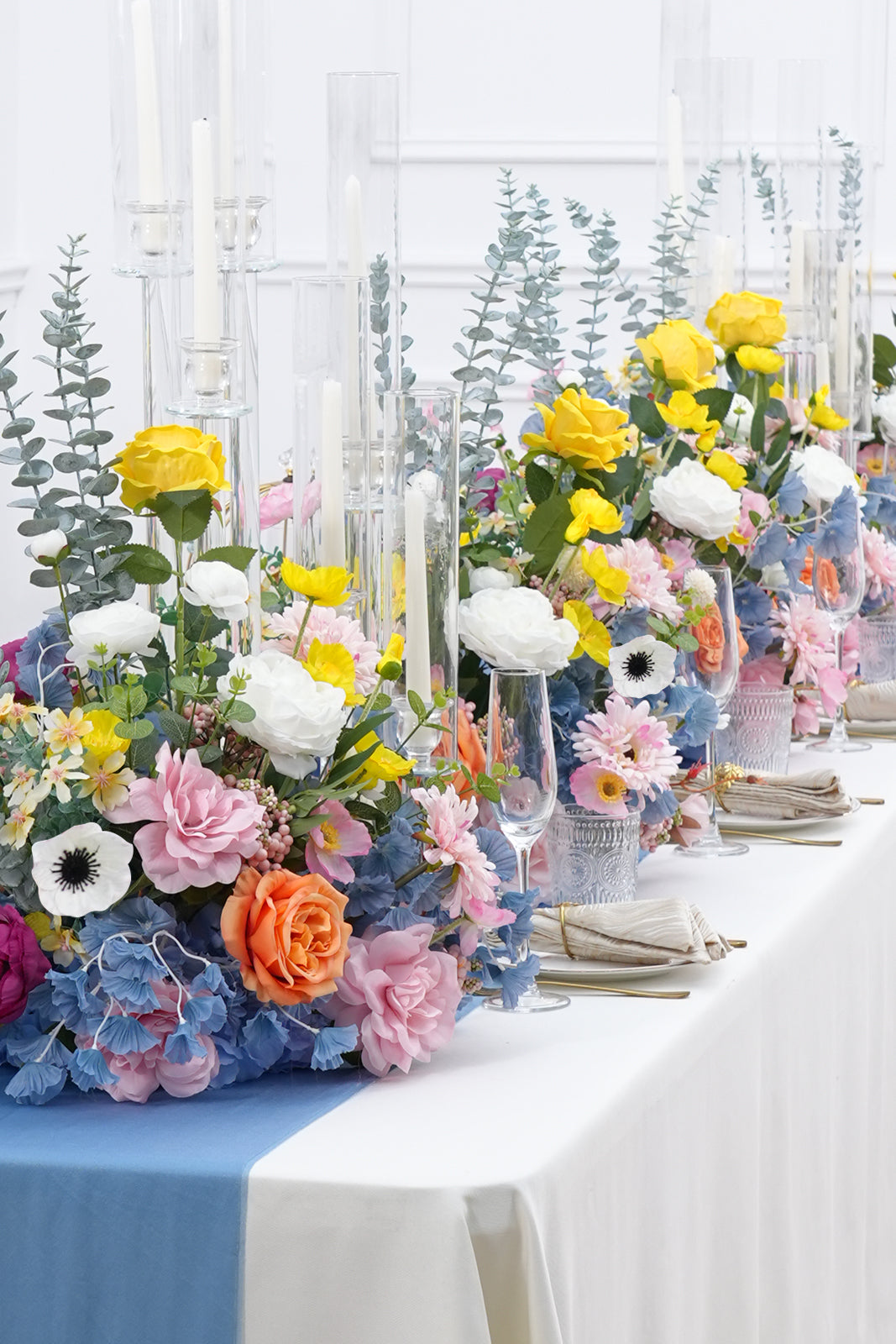 Color Inspiration: Brighten your wedding reception with our vibrant, colorful table centerpiece! This exquisite arrangement features a diverse array of blooms in captivating hues, artfully paired with eucalyptus leaves. Perfect as wedding reception centerpieces, it adds a touch of whimsical elegance. Create unforgettable memories with this stunning floral masterpiece that brings joy and sophistication to any celebration.