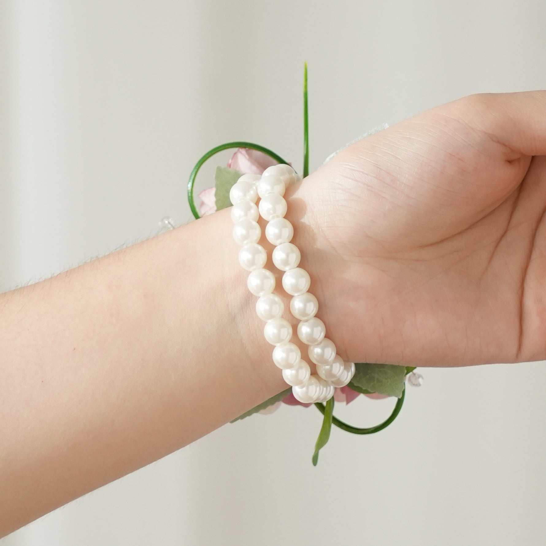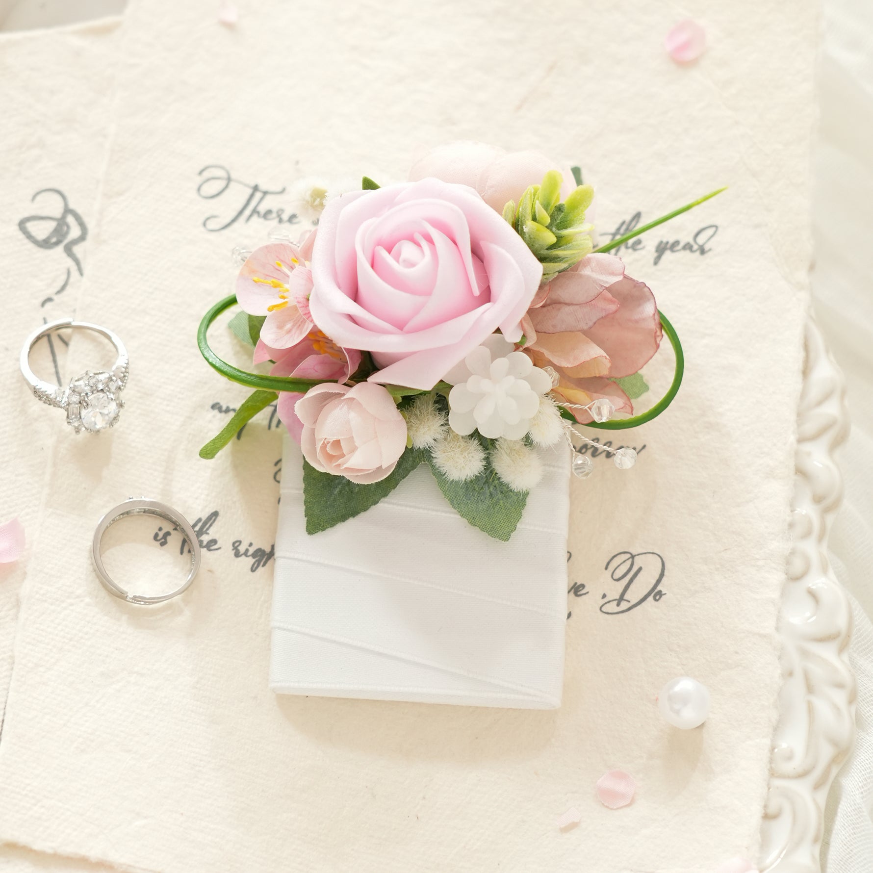 Color Inspiration: Soft blush pink and creamy white blend with fresh greenery in this delicate floral set, creating a gentle, romantic palette. The muted tones evoke springtime charm, while subtle crystal accents add a dreamy, ethereal touch. Sweet yet refined, this color scheme radiates timeless romance, perfect for weddings.