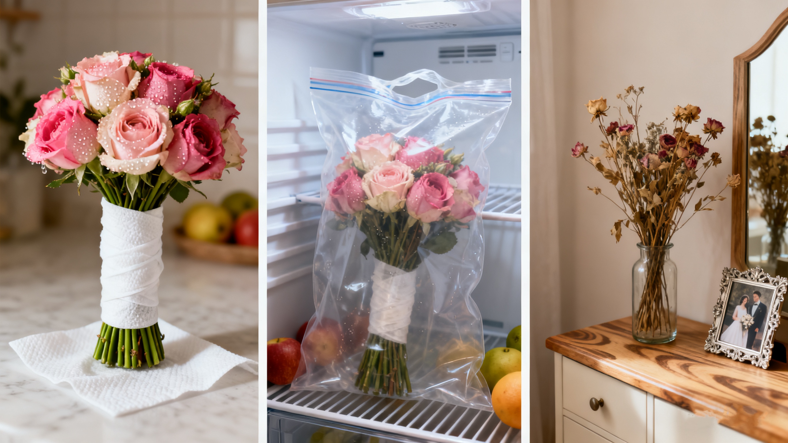 Wrap the bottom of the bridal bouquet in a damp paper towel, place in a plastic bag, and refrigerate. After the wedding, air-dry it to make a dried flower as a long-lasting souvenir.