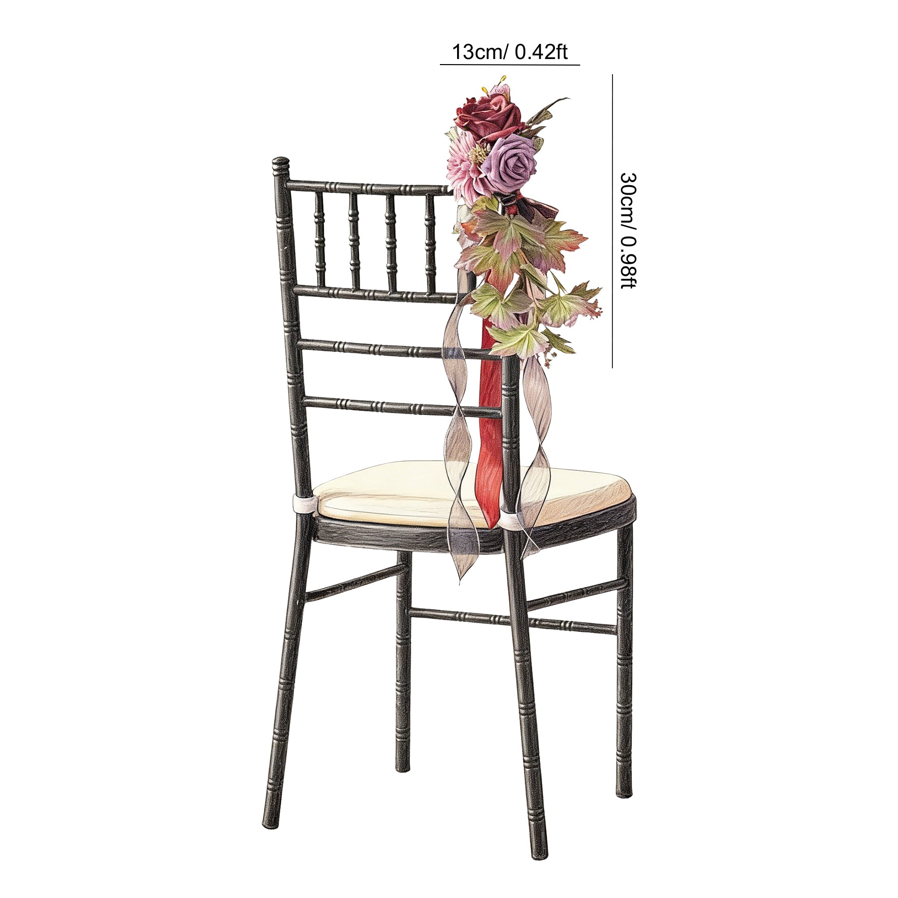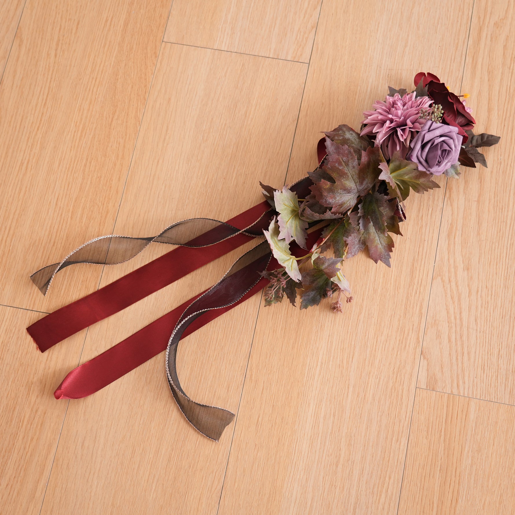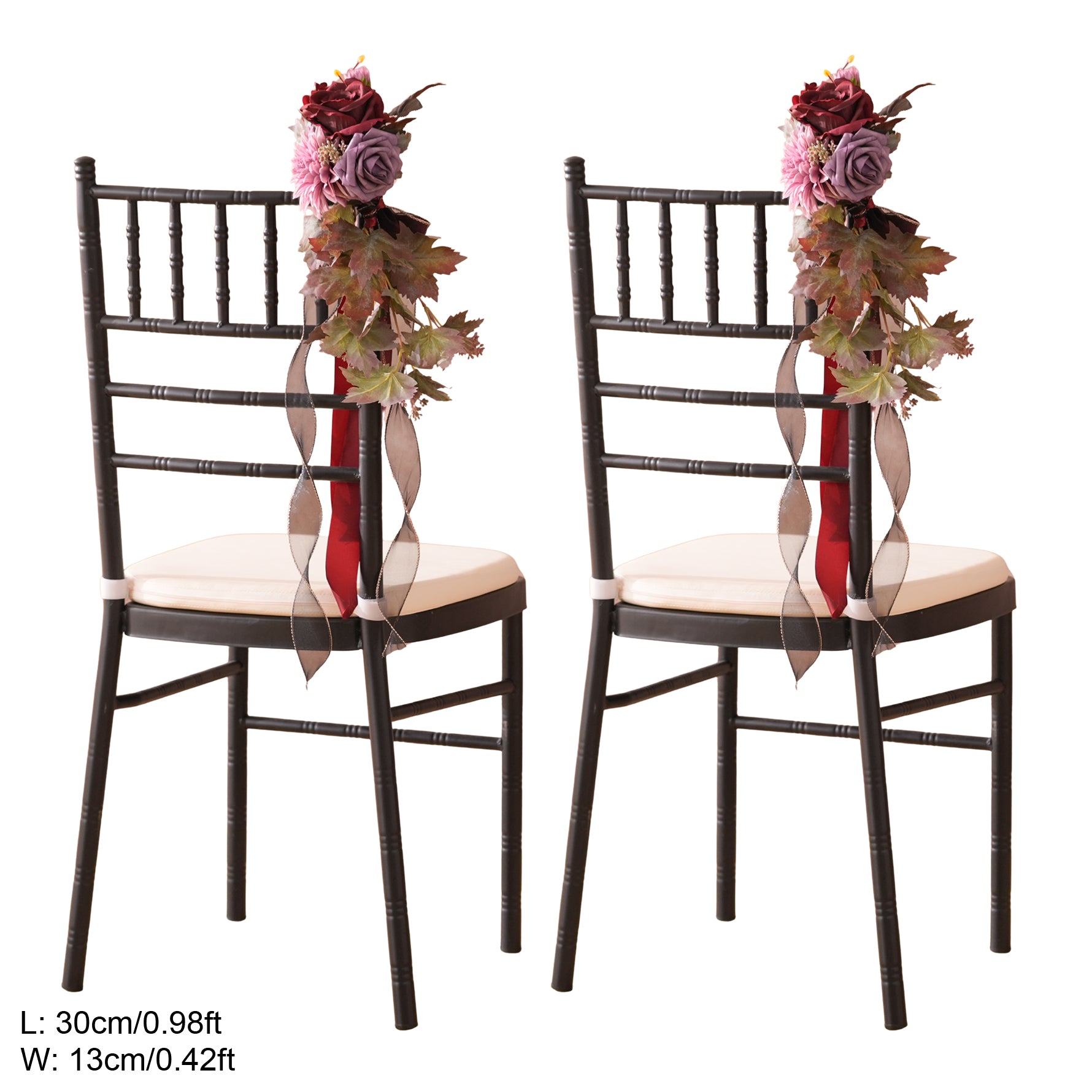 Color Inspiration: Elevate your event with our Burgundy Rose Chair Flowers (4-Piece Set). These exquisite decorations feature rich, wine-red roses artfully combined with vibrant maple leaves, creating a touch of autumnal romance.