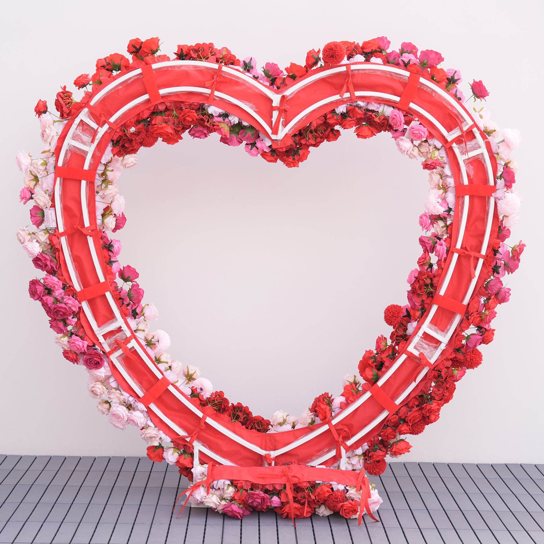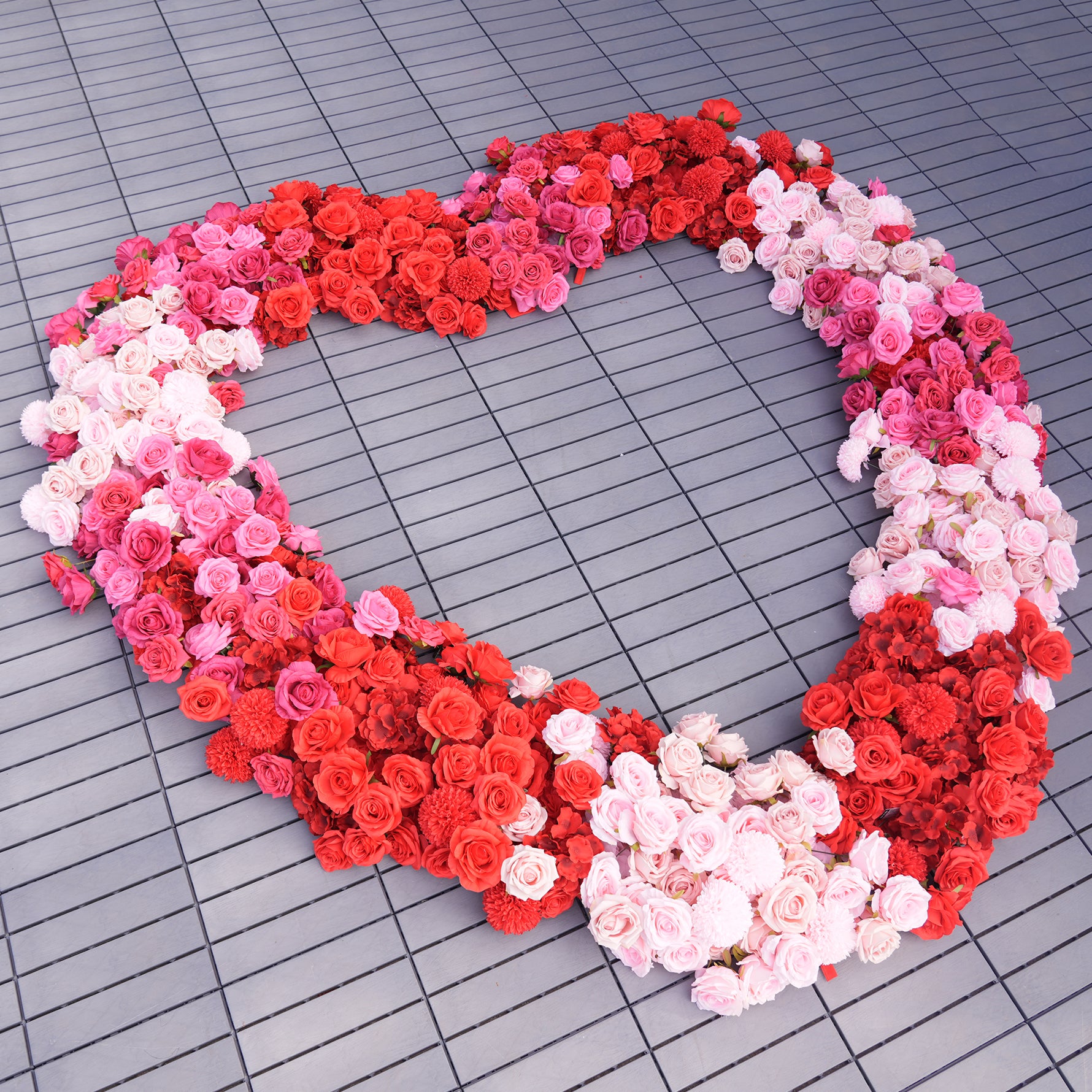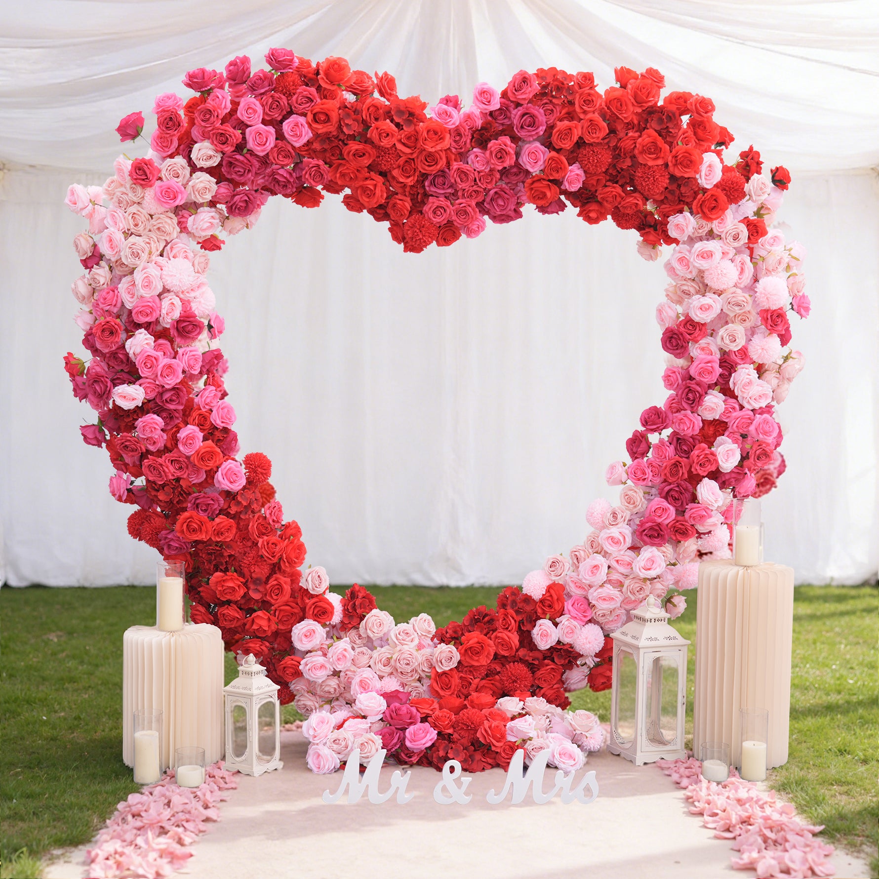 Color Inspiration: Elevate any occasion with our Gradient Hot Pink Red Heart Rose Arch. Featuring vibrant faux roses in a stunning color gradient, and a soft fabric base. Perfect for weddings, parties, and proposals. This arch creates a romantic, eye-catching focal point.