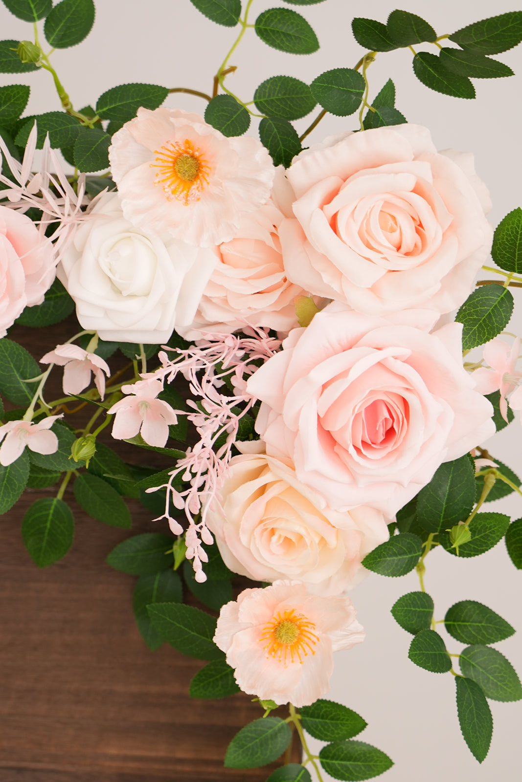 Color Inspiration: Welcome guests with this charming set! Soft pink roses and lush greenery create a warm, inviting entrance. The delicate pink hues symbolize grace and joy. Enjoy everlasting beauty without the upkeep – these artificial flowers require no watering. Perfect for weddings, parties, or brightening your home. A delightful touch of elegance that lasts. Bring a touch of romance to any space.