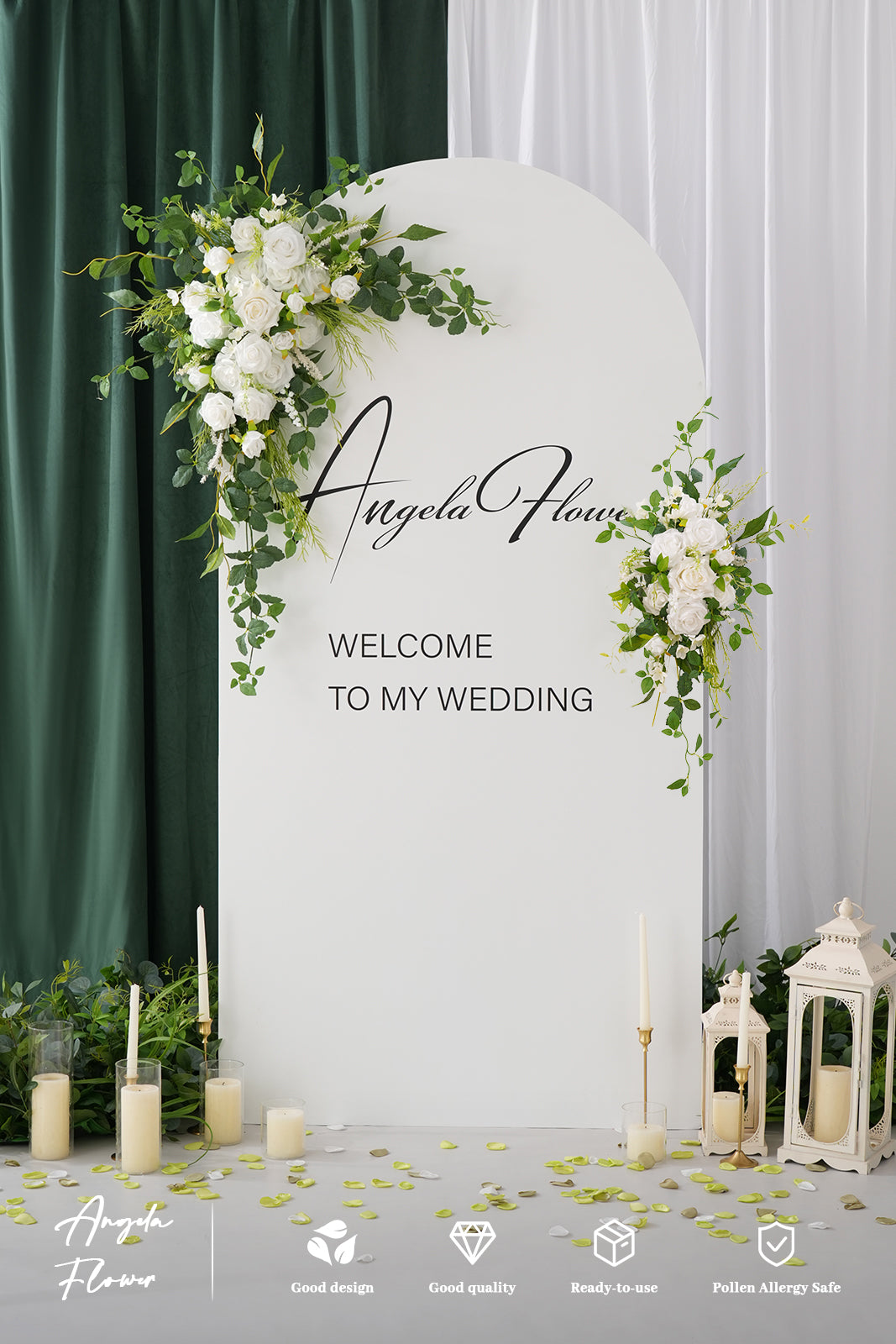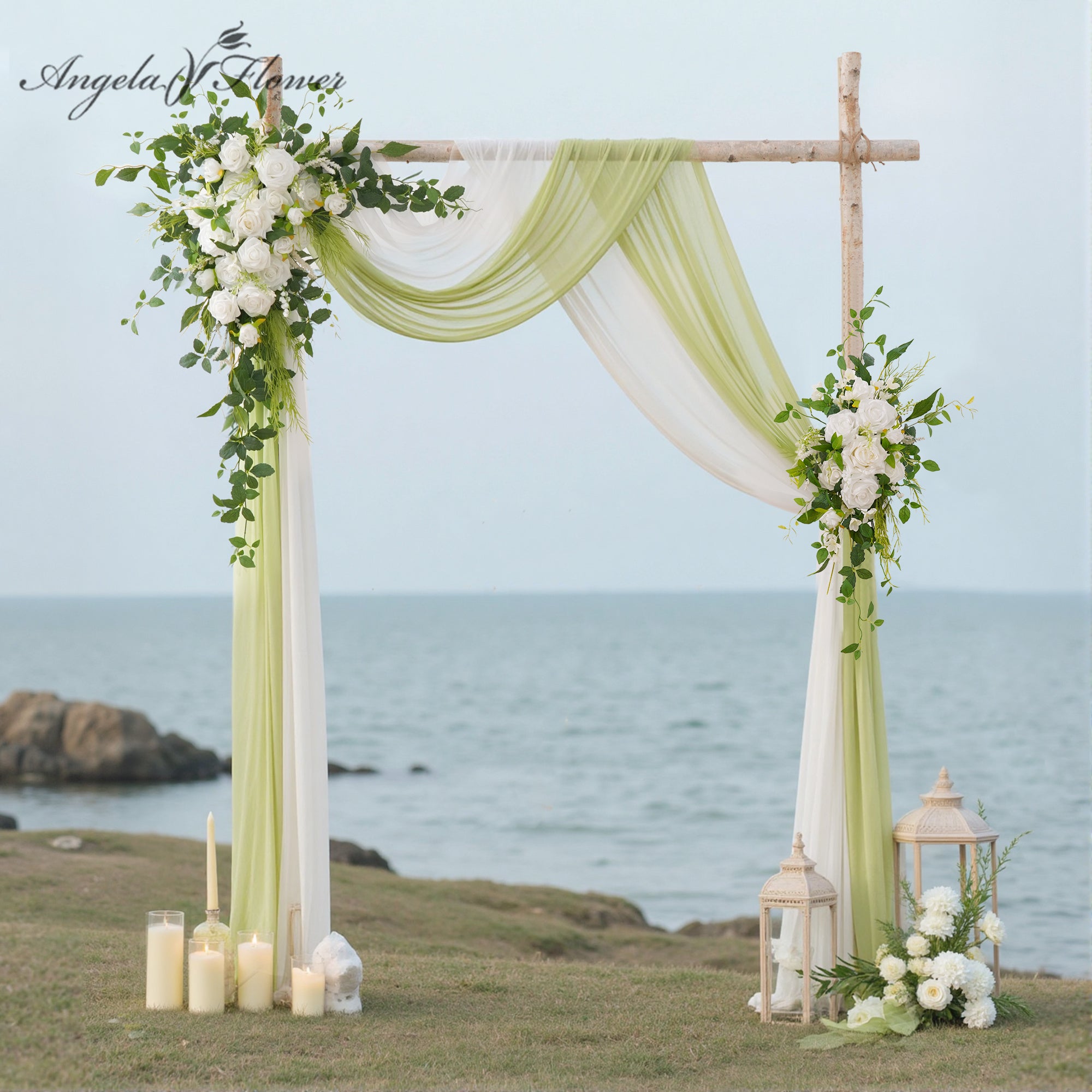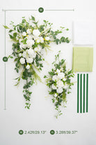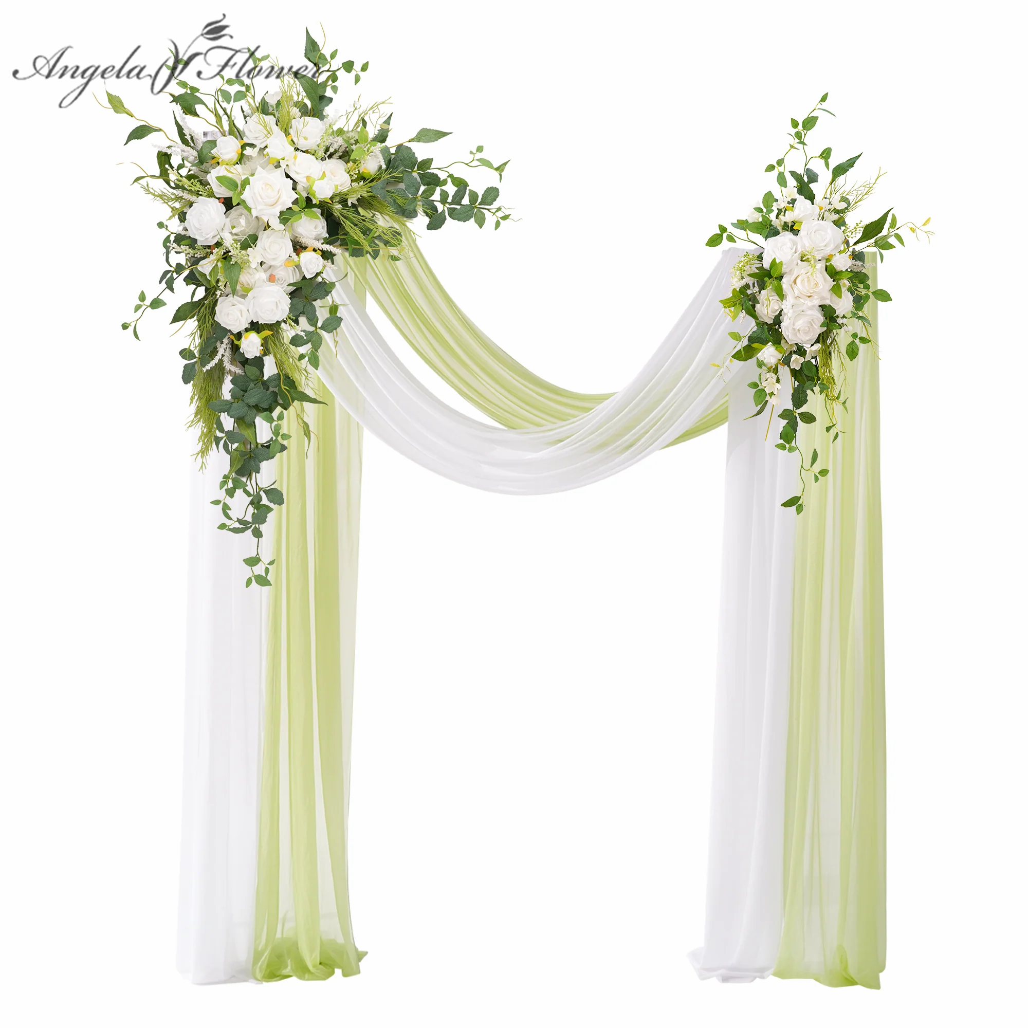 Size and package: luxury corner flower x1 luxury corner flower (39'' H * 29'' W), tie-back flower (29'' H * 7.8'' W), 6m white wrinkle-resistant chiffon x1, 6m green wrinkle-resistant chiffon x1, velcro fasteners x4. Carefully packaged in a reinforced box to prevent damage during transportation.
