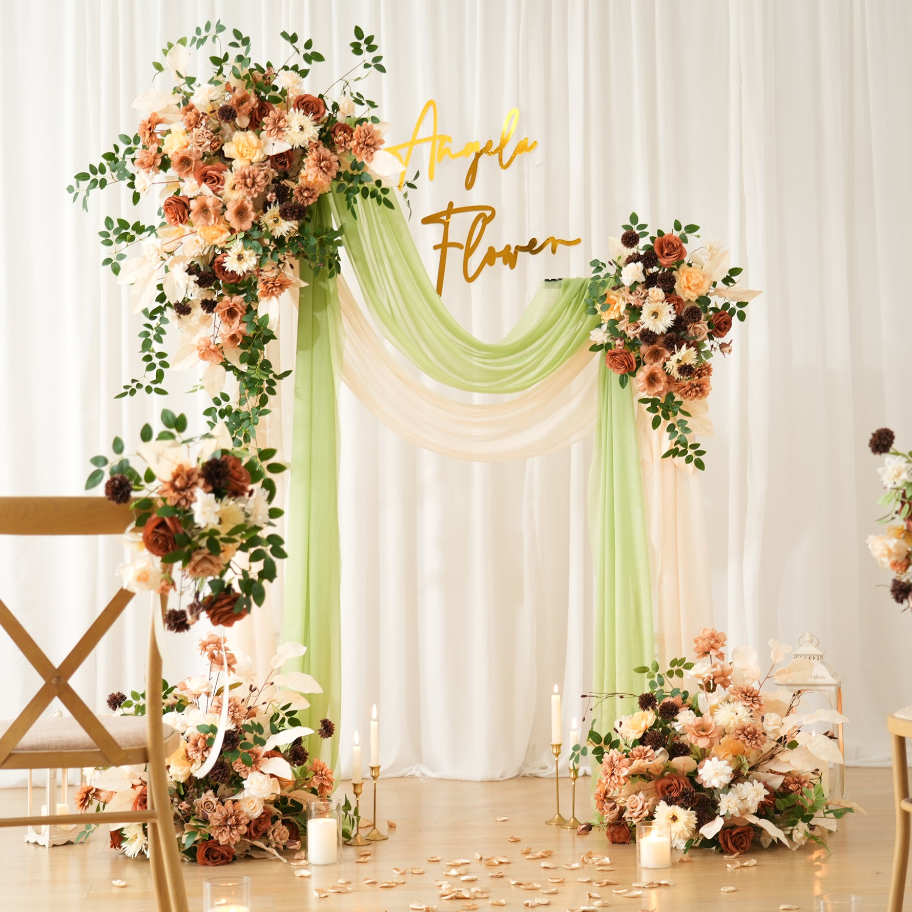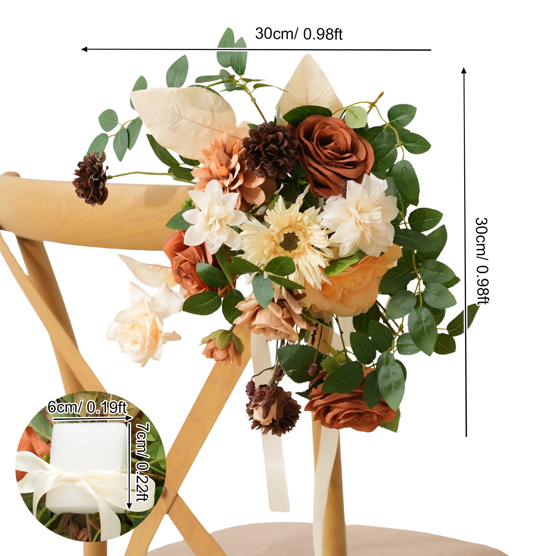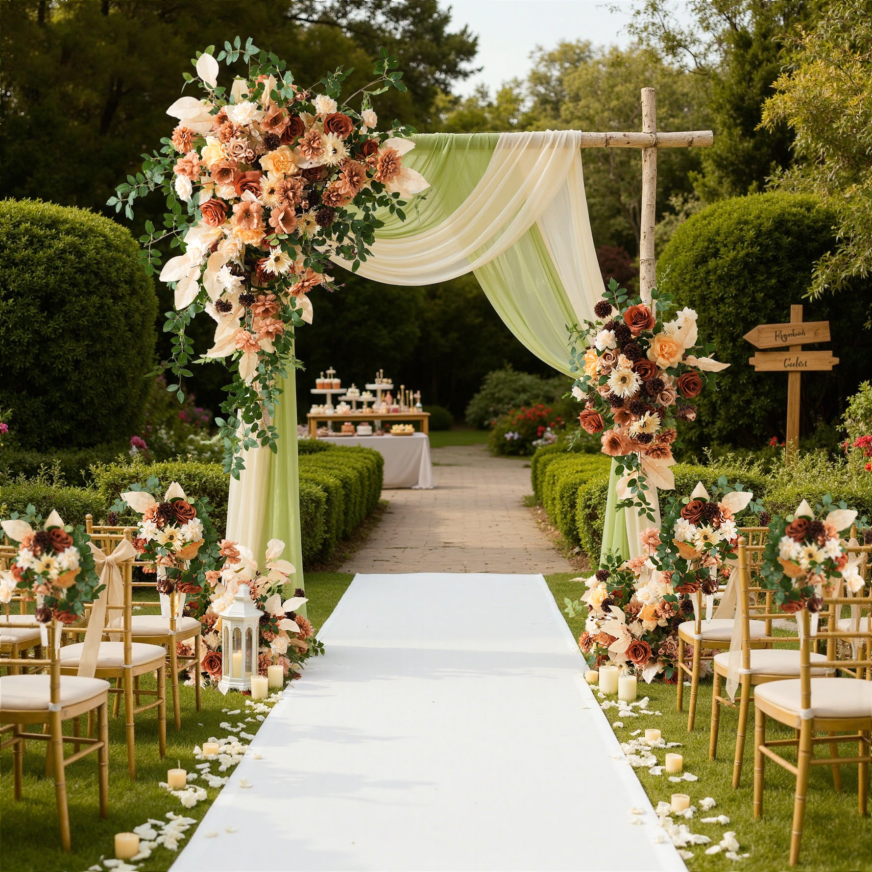 Color Inspiration: This artificial collection features rich coffee tones and lush greens, including hanging garlands, aisle markers, and chair accents. Perfect for rustic weddings, fall events, or adding natural charm. Create a scene that is as elegant as it is cozy! This set is the perfect scene.
