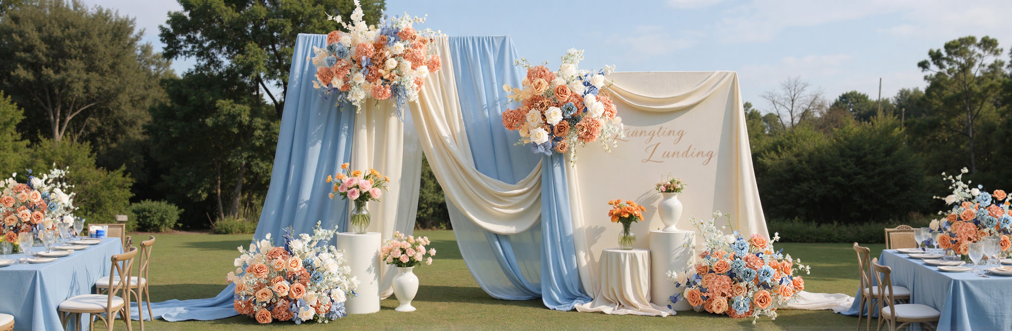 This arrangement of flowers features a rich coffee color and a dreamy blue tone.