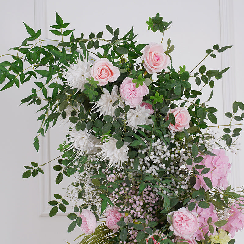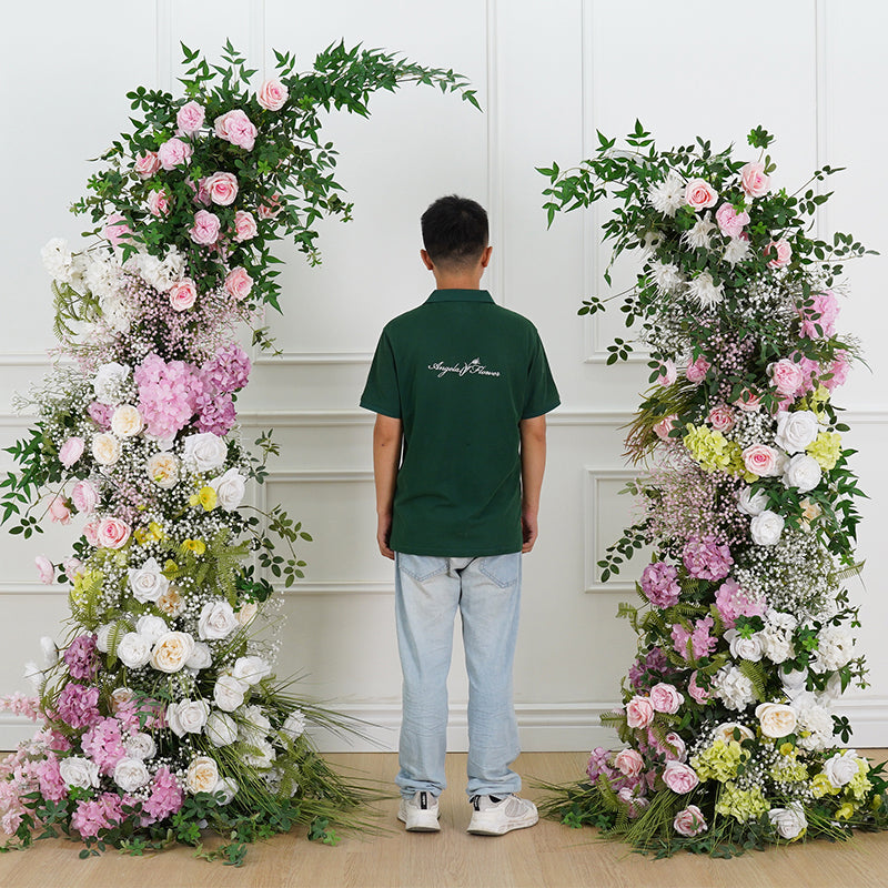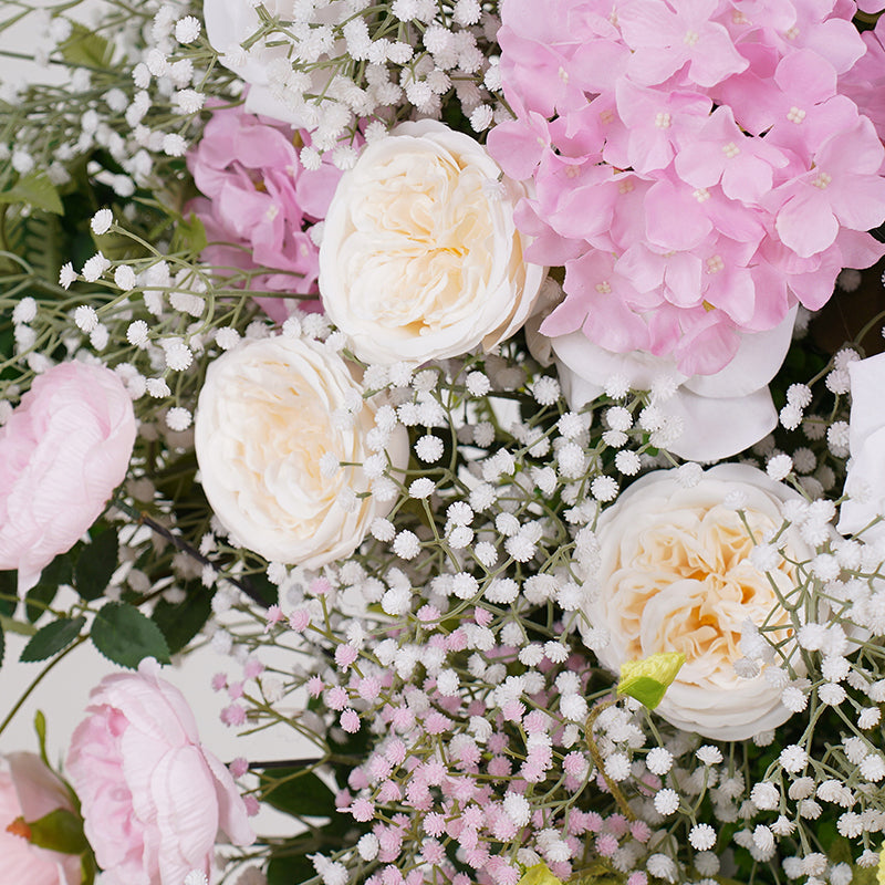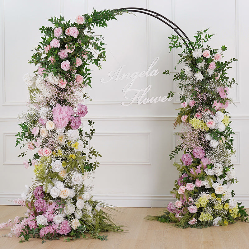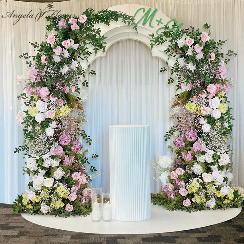 A7847 Pink White Rose Babysbreath Flower Row Decor Wedding Backdrop Horn Arch