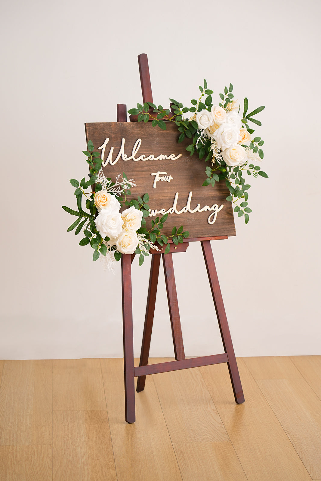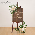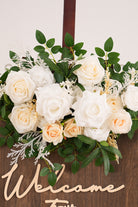 Color Inspiration: Create a picture-perfect wedding entrance with our champagne white rose welcome sign flower. This versatile floral decor piece is ideal for welcome signs, arches, and more. The classic color palette of champagne and white complements any wedding theme, bringing a touch of elegance to your celebration. Easy to attach, it provides a simple yet stunning way to enhance your venue.